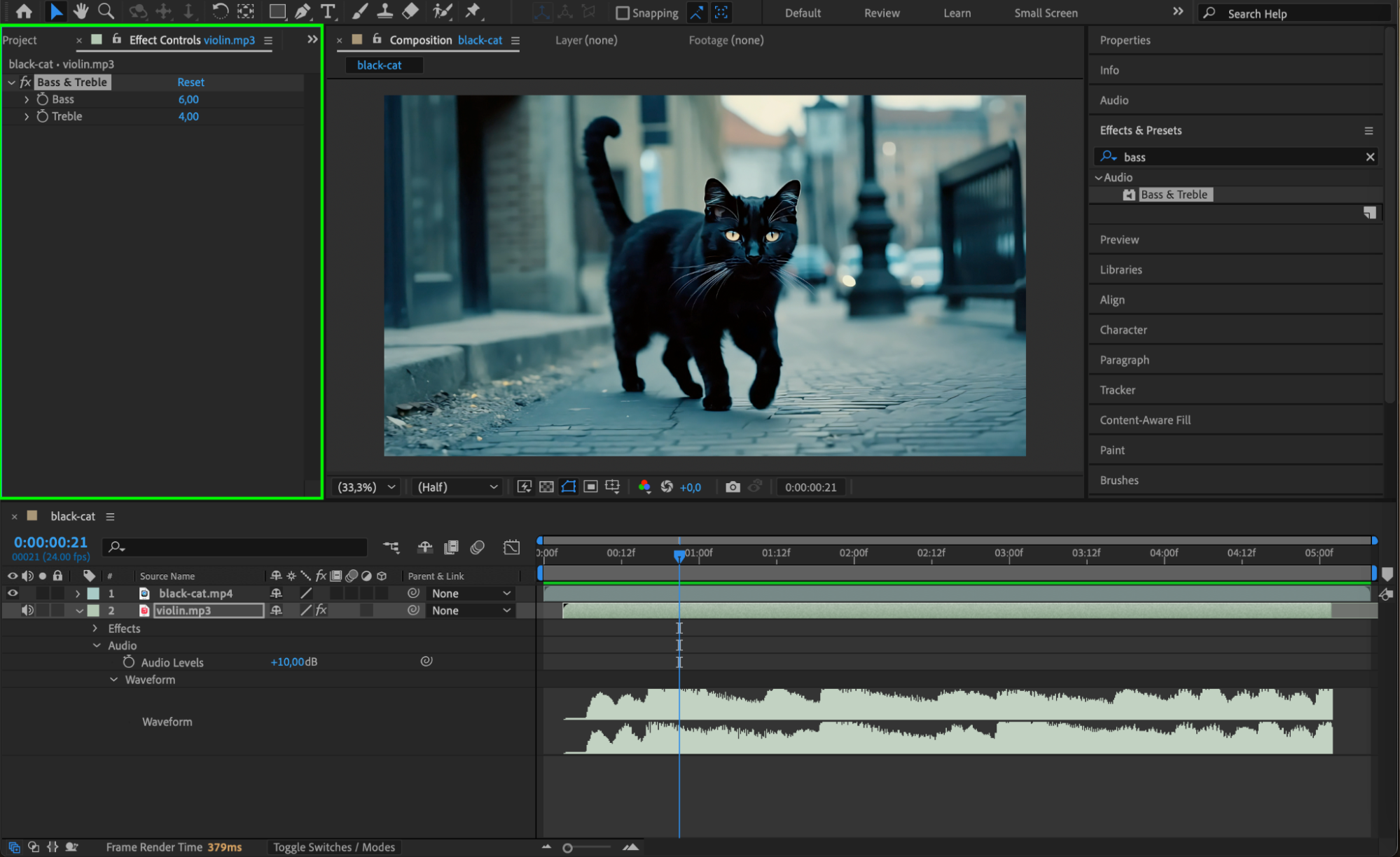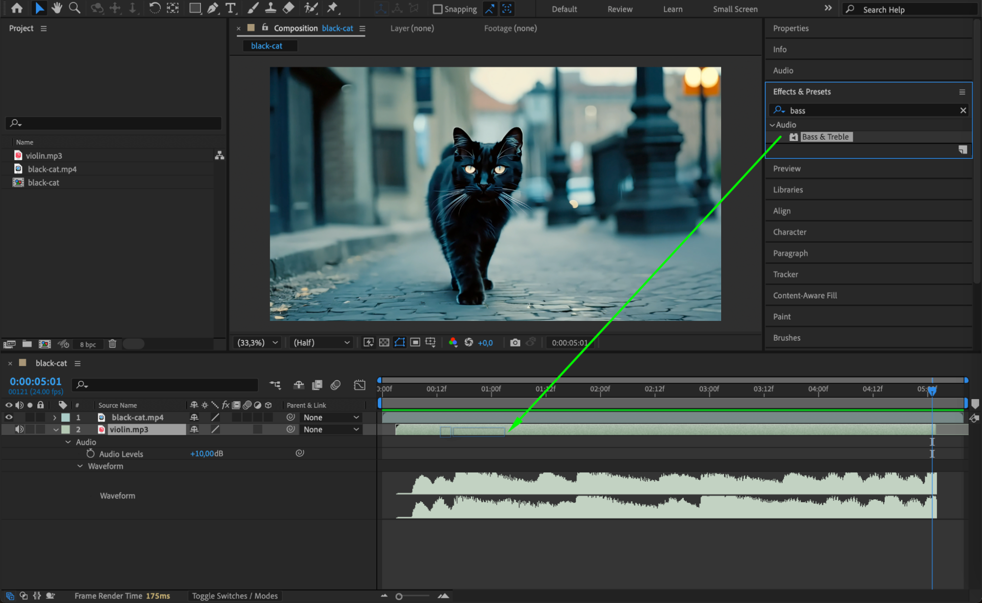 After Effects offers basic audio effects under Effects & Presets > Audio Effects. For instance, apply the Bass & Treble effect to enhance sound quality or Stereo Mixer to adjust left and right channels.