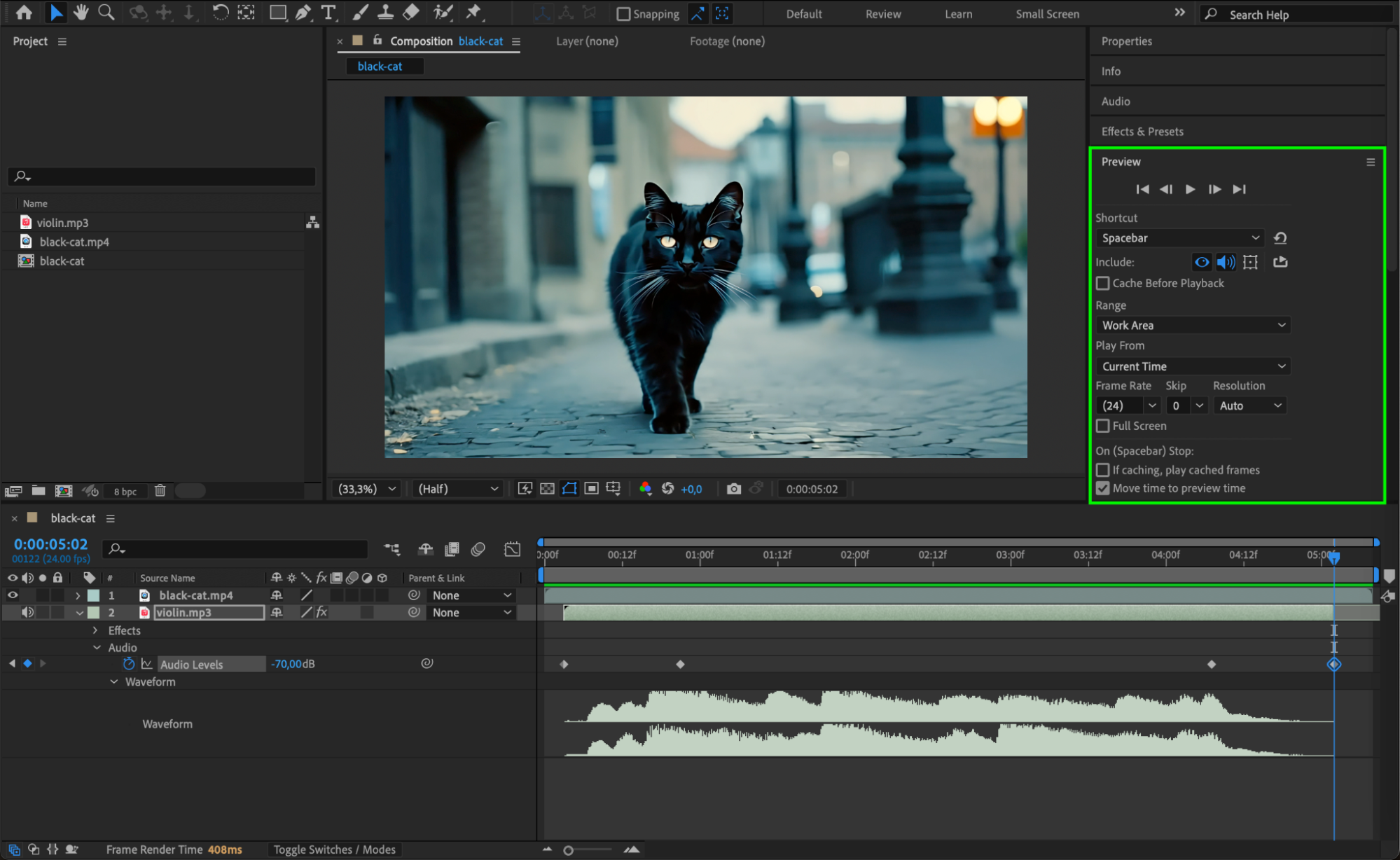 Press the spacebar or use a RAM Preview to ensure the MP3 syncs well with your visuals. Make any final adjustments to the timing, volume, or animations as needed.