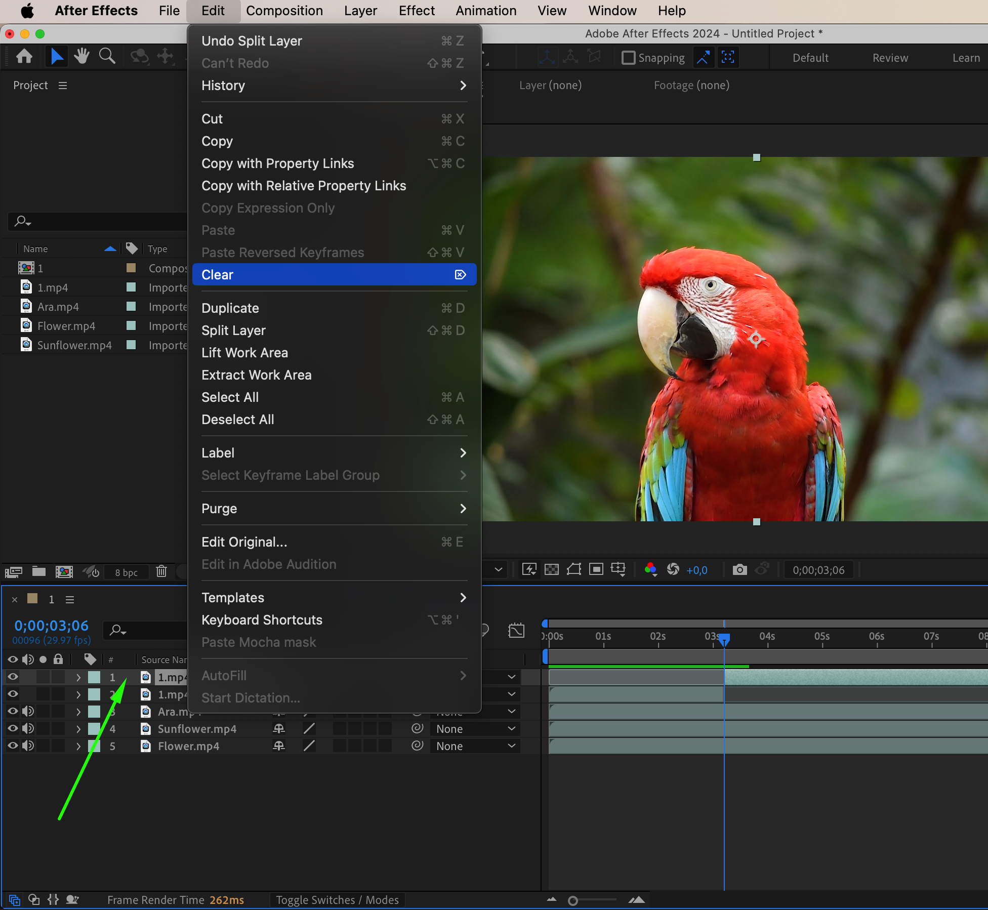 To better manage your clips, use the shortcut “Ctrl/Cmd + Shift + D” to split layers at the Current Time Indicator position. This can help you separate sections of a clip or adjust the timing. Use the “Delete” key to remove unnecessary layers and keep your timeline organized. This method streamlines the editing process and makes it easier to handle complex projects.