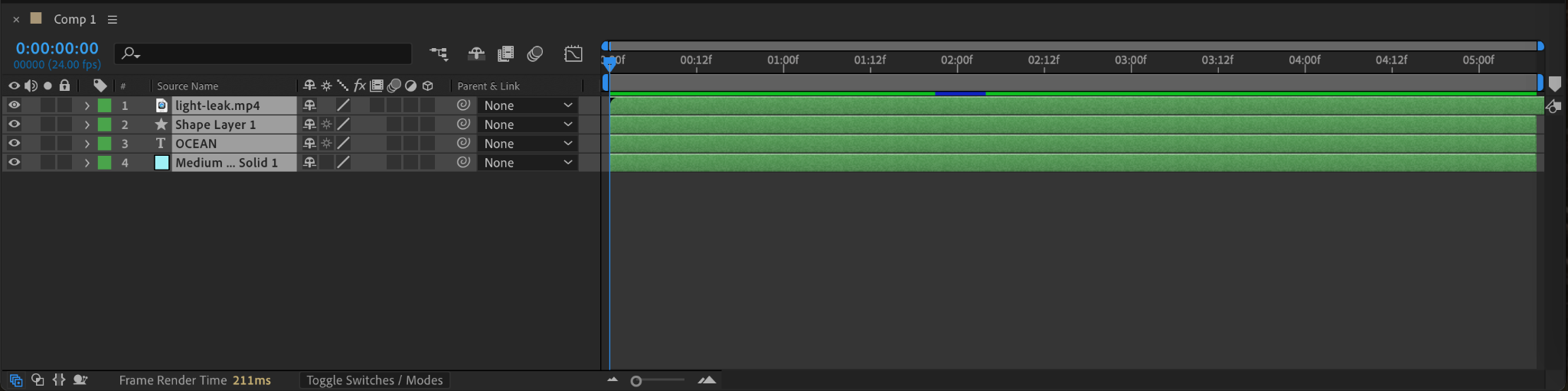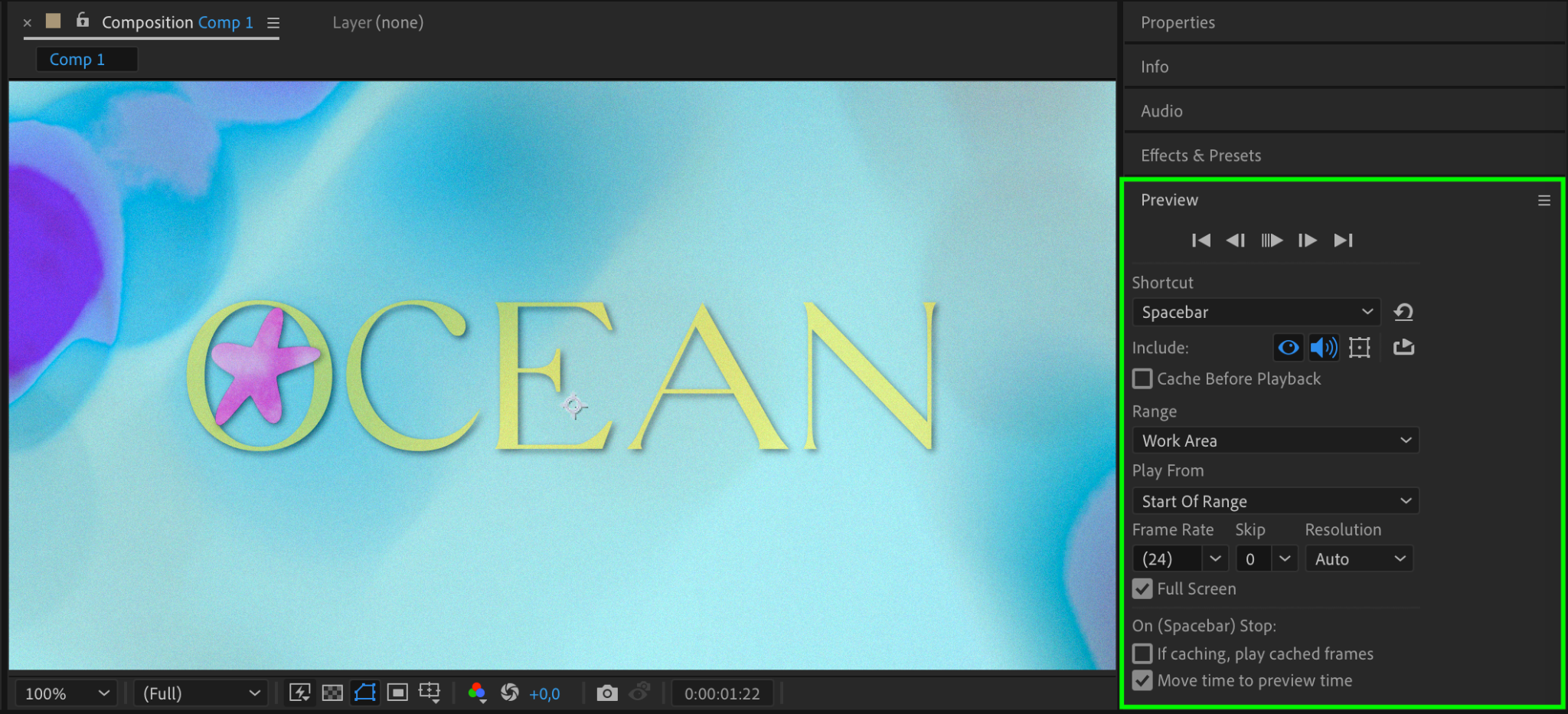 To preview your composition and ensure everything is working as expected, press the Spacebar to play through your animation. This helps you check timing, layering, and effects before moving on to rendering. If something needs adjustment, go back to the timeline and make the necessary changes.