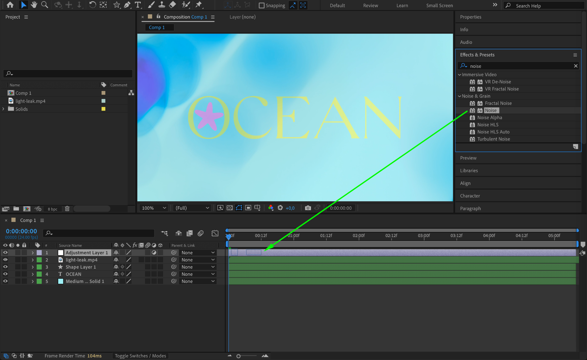 After creating an adjustment layer or selecting a specific layer, you can add effects to enhance your composition. Go to the Effects & Presets panel, search for the desired effect (such as Glow, Blur, or Color Correction), and drag it onto the selected layer or adjustment layer. This allows you to apply professional-grade effects to your composition, creating dynamic visual results.