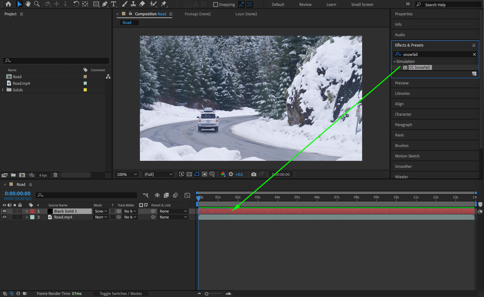 Select the black solid layer, then go to Effect > Simulation > CC Snowfall. This will apply a snow effect to the layer. CC Snowfall is a powerful tool for generating realistic snow with customizable settings, perfect for creating a wintery atmosphere in your scene.