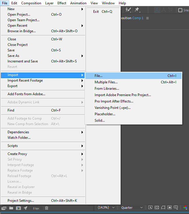 Open After Effects and create a new composition by navigating to the “Composition” menu and selecting “New Composition” or hit Ctrl (Windows) or Command (Mac) + N. Set the desired settings for your composition, such as the resolution, duration, and frame rate.