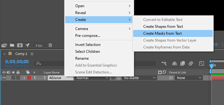 To create a path for a stroke effect, right-click on the layer – Create – Create Masks from Text.