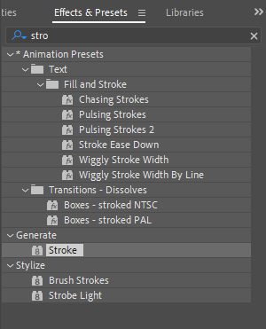 Go to the “Effects & Presets” panel and search for the “Stroke” effect. Once found, drag and drop the effect onto the created layer in the Composition panel. The Stroke effect will now be applied to the layer.