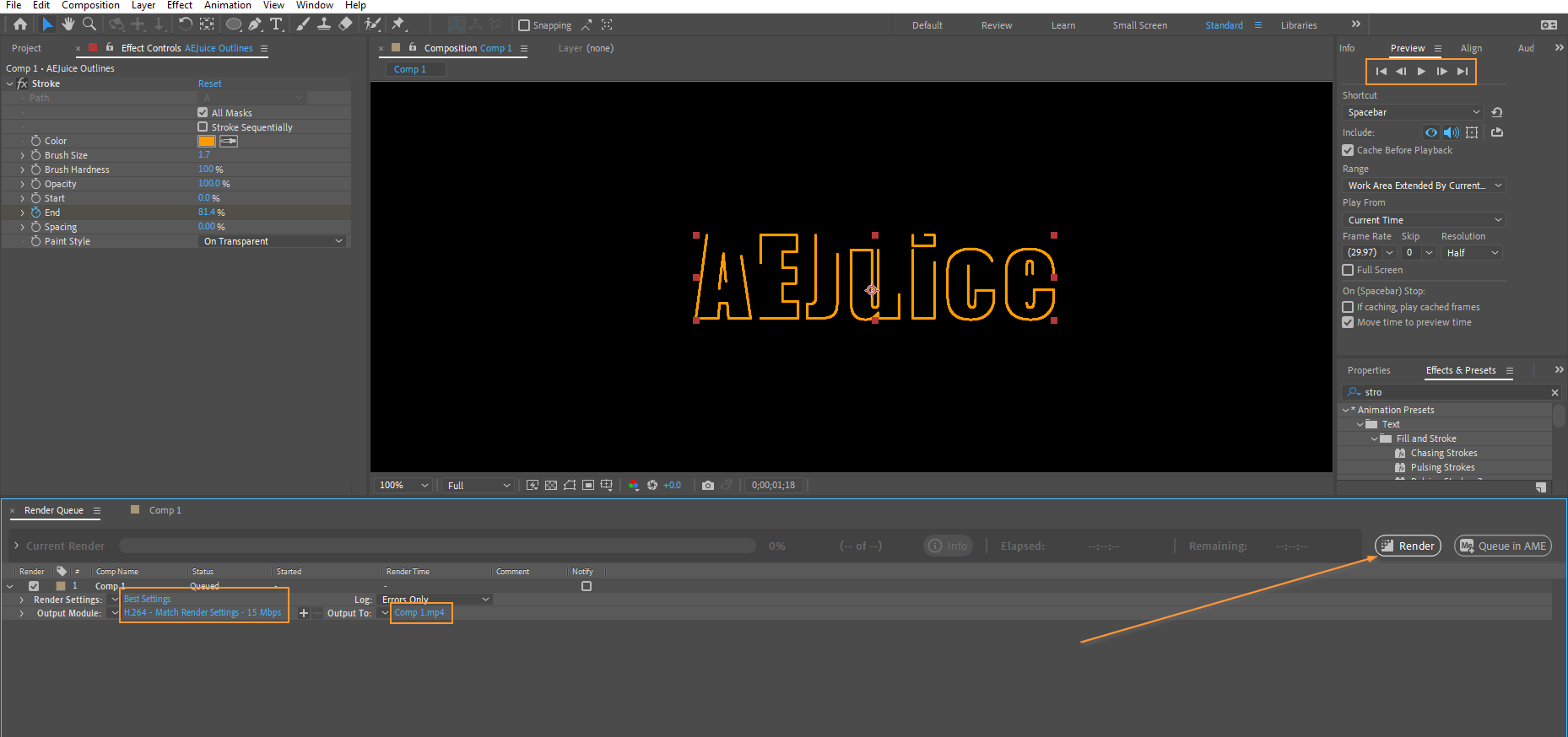 Once you’re satisfied with your stroke effects, preview your composition by pressing the Spacebar key or by clicking the “RAM Preview” button. If you’re happy with the result, you can render your composition by going to the “Composition” menu and selecting “Add to Render Queue.” Adjust the render settings and output format, then click the “Render” button to export your finalized composition with the stroke effects.