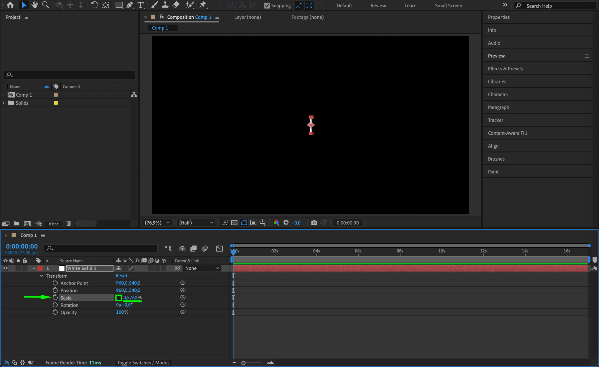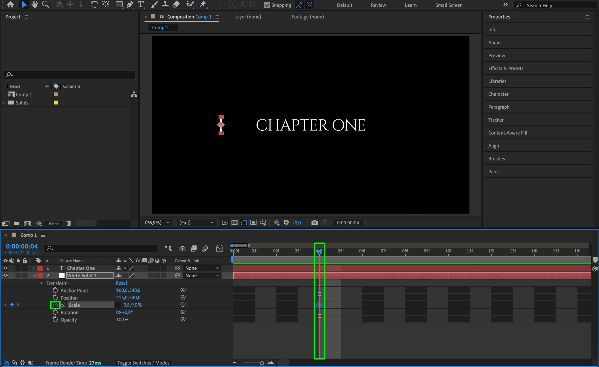 Move the Current Time Indicator (CTI) 4 frames forward and click the stopwatch icon next to Scale to create a keyframe.