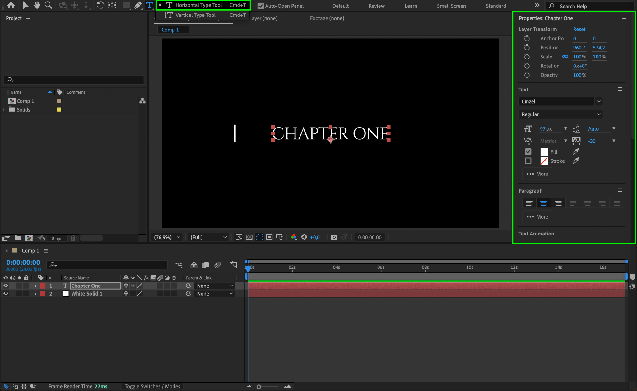 In the Transform settings of the solid layer, unlink the scale properties by clicking the chain icon. Set the values to (0.5, 9) to create a thin vertical bar. Adjust the position so that the solid is placed at the starting point of your text.