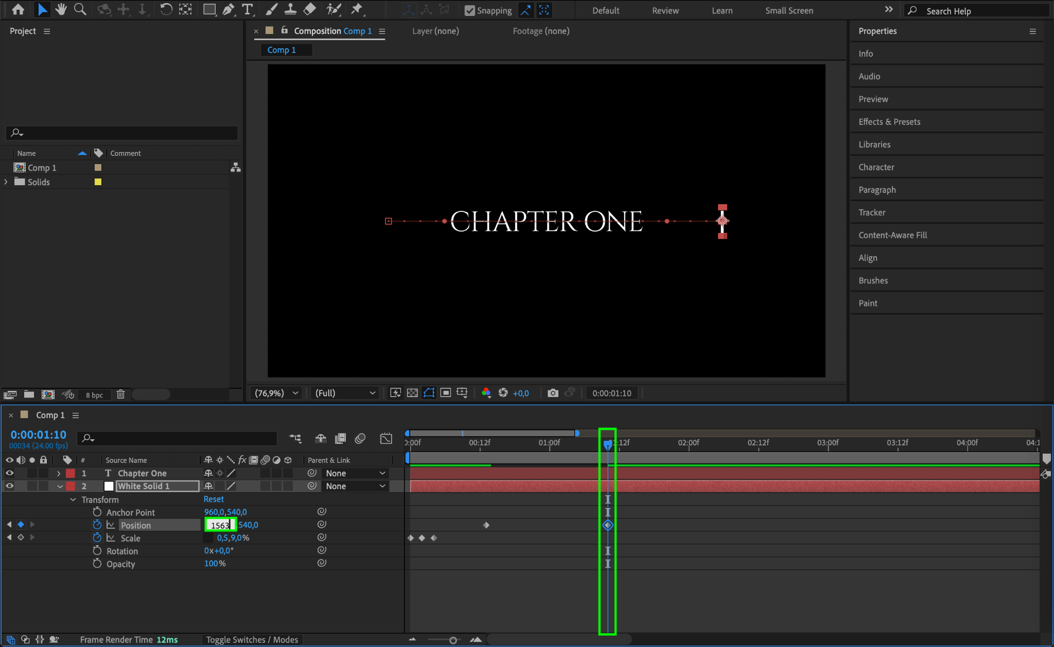In the Timeline Panel, enable Motion Blur for both the text and the solid layer to create a more natural movement.