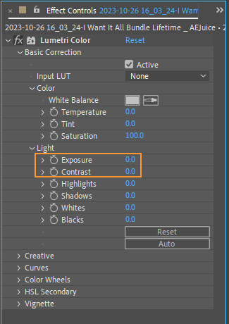 To control the overall brightness and contrast of your footage, use the Exposure and Contrast sliders in the Lumetri Color panel. Increase or decrease the exposure to brighten or darken the image, and adjust contrast to enhance the visual depth and richness. Play around with these settings to achieve the desired look.