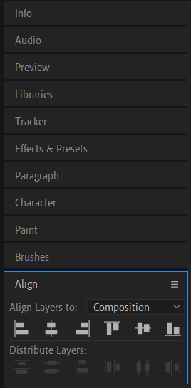 Sometimes, you may need to align elements to the composition rather than other layers or objects. To quickly align a layer to the composition, select the layer, and then press “Ctrl/Cmd + Alt/Option + Shift + H”. This hotkey centers the layer horizontally, vertically, or both, depending on your selection. It’s a handy shortcut for achieving composition-based alignment.