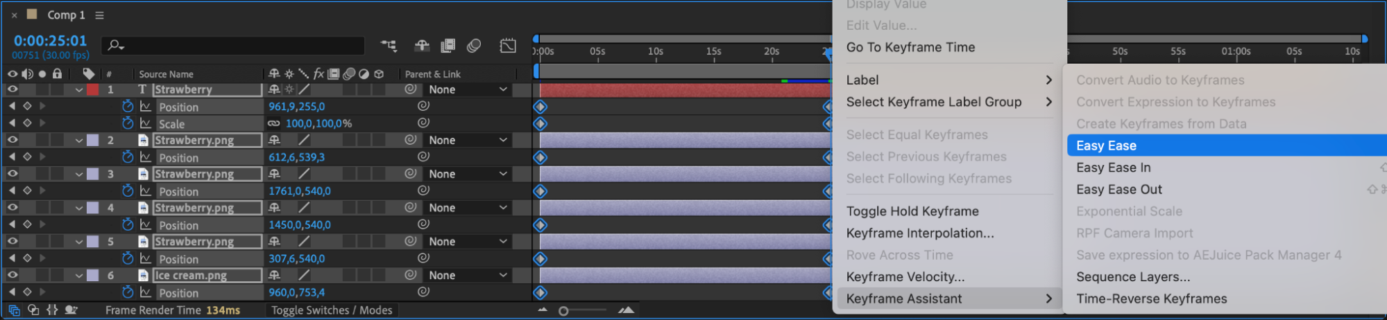 To make animations smoother and more natural, apply Easy Ease to keyframes. Right-click on the selected keyframes, go to Keyframe Assistant, and choose Easy Ease. This helps create smoother acceleration and deceleration in motion.