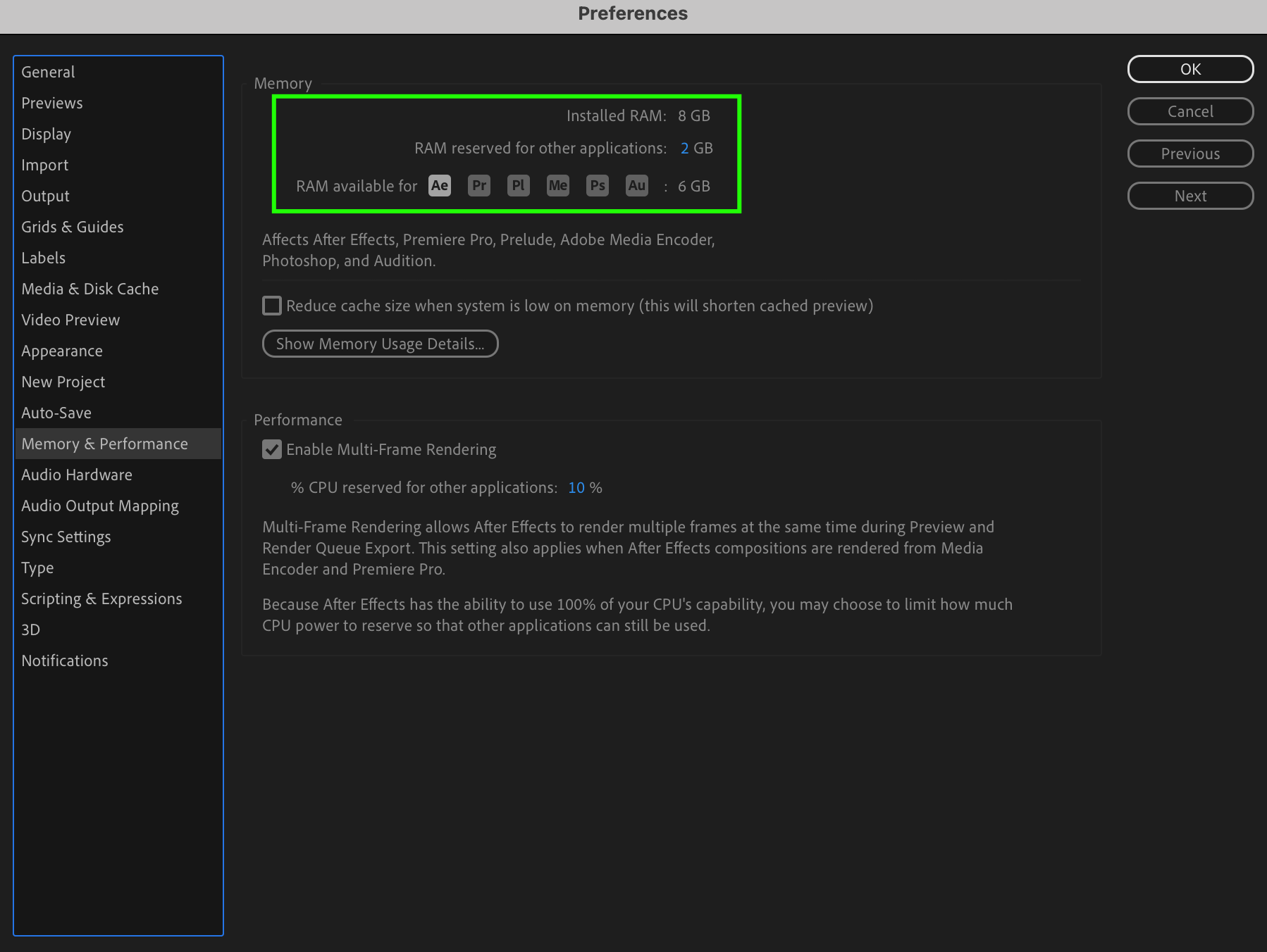 3. Adjust After Effects Preferences: Open Adobe After Effects and go to “After Effects” > “Preferences” > “Memory & Performance”. In the “Memory” section, you can specify the percentage of RAM you want to allocate to After Effects. Increase this value up to a certain threshold that won’t negatively impact other system processes. Be mindful of the RAM requirements of other software you may be using simultaneously.