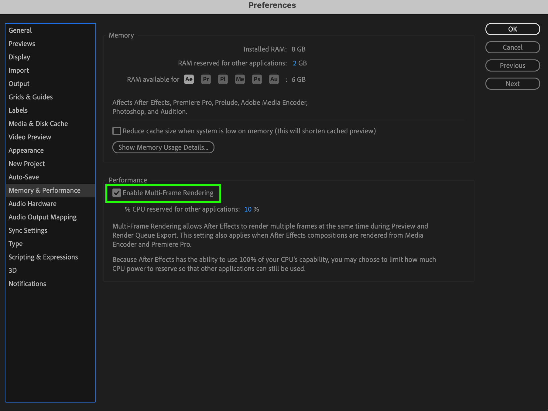 4. Enable Multi-Frame Rendering: After Effects has a feature called “Multi-Frame Rendering” that allows it to utilize multiple processor cores efficiently. To enable this option, navigate to “After Effects” > “Preferences” > “Memory & Performance”, and check the box next to “Enable Multi-Frame Rendering.” By utilizing multiple cores, rendering tasks can be distributed evenly, leading to faster processing times and overall improved performance.
