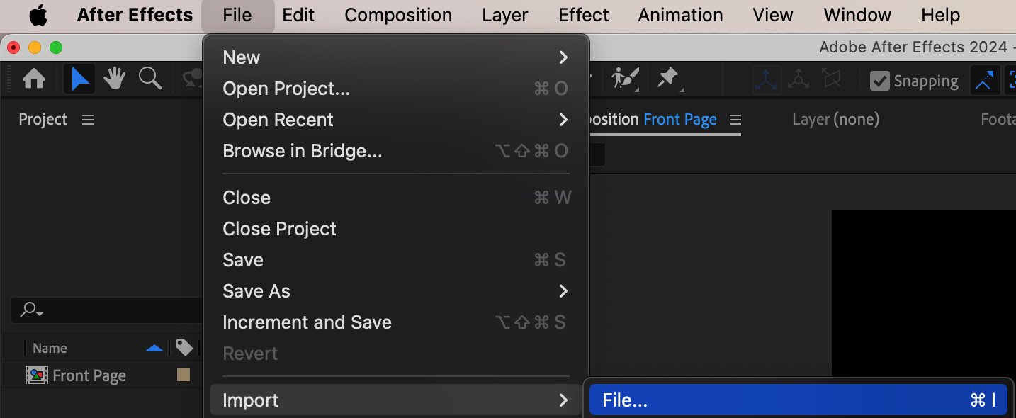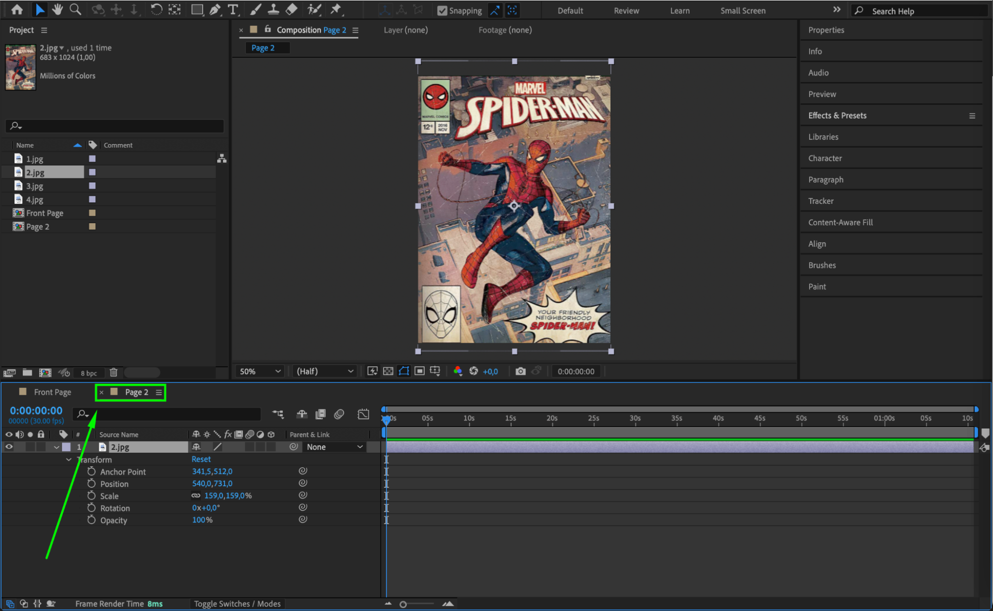 Import your page images (front cover, page 2, and page 3) into After Effects. These will be used to animate the book opening.