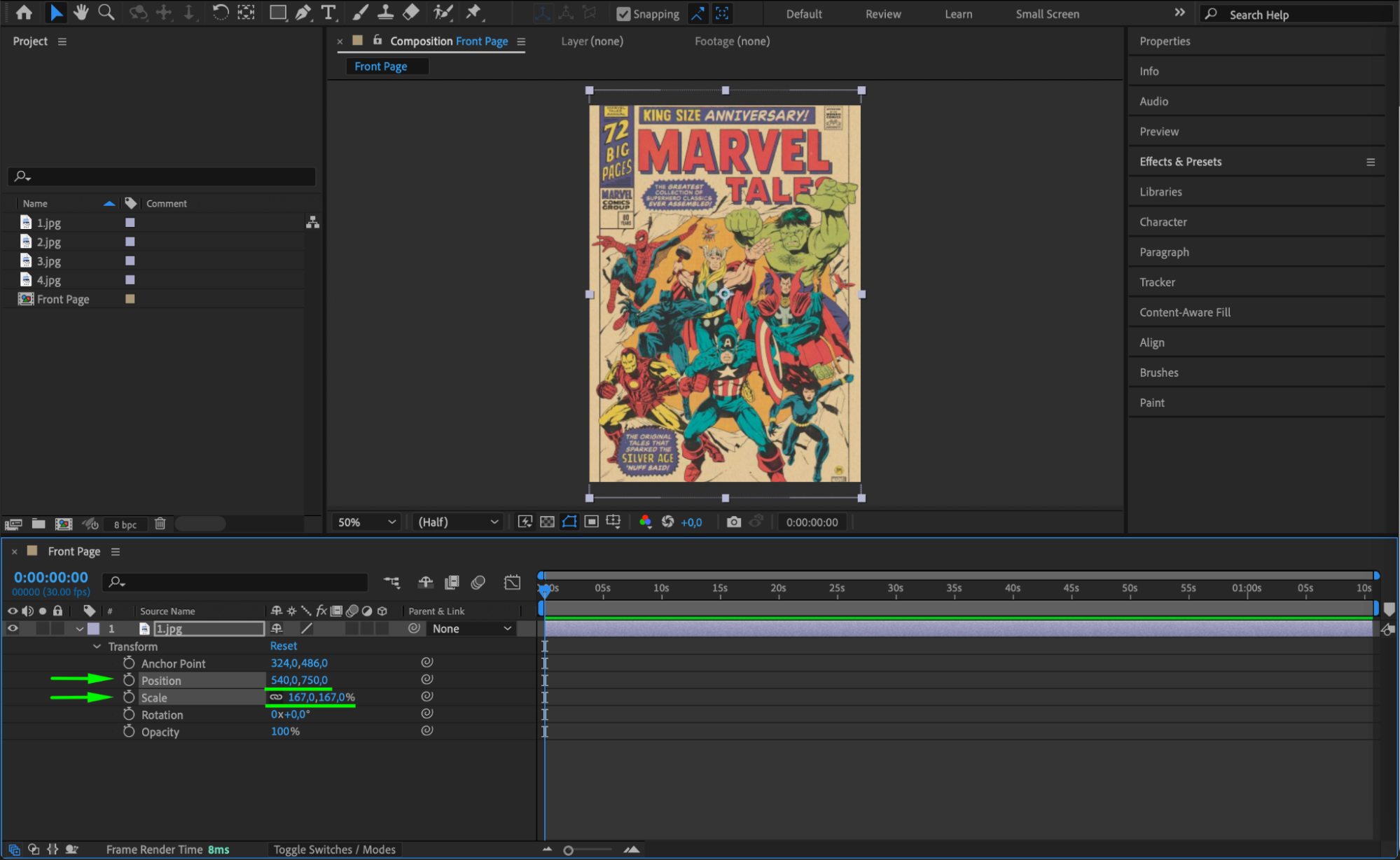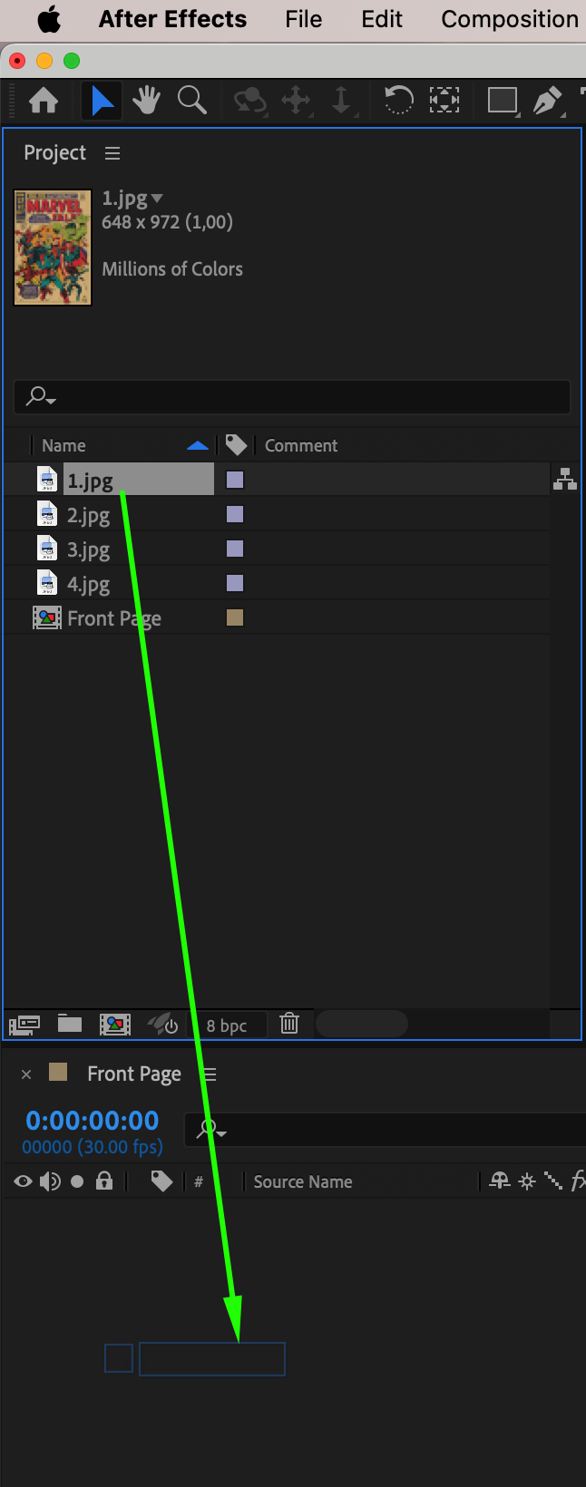 Drag the Front Page image onto the timeline of the “Front Page” composition. This will be the first page of your book.