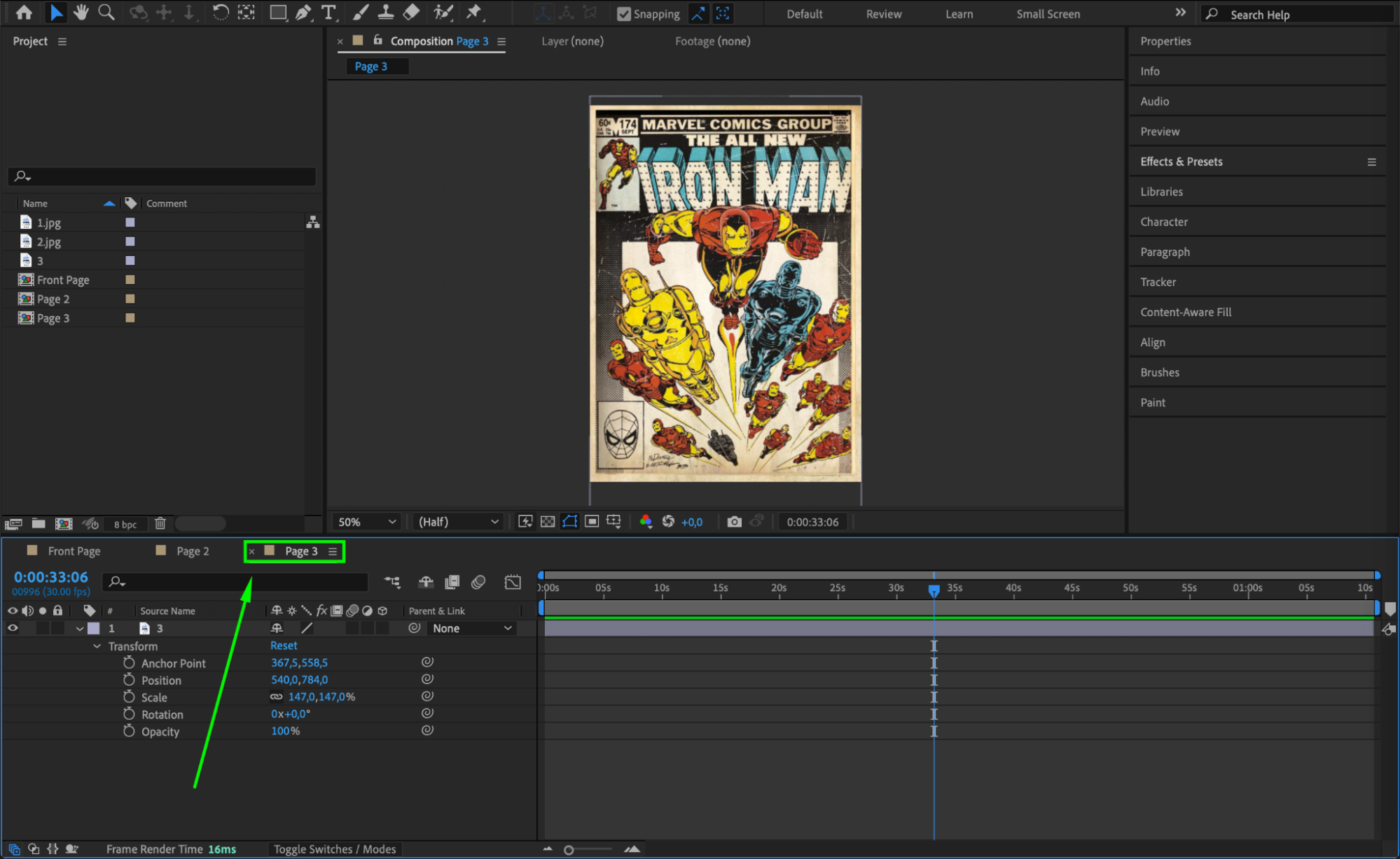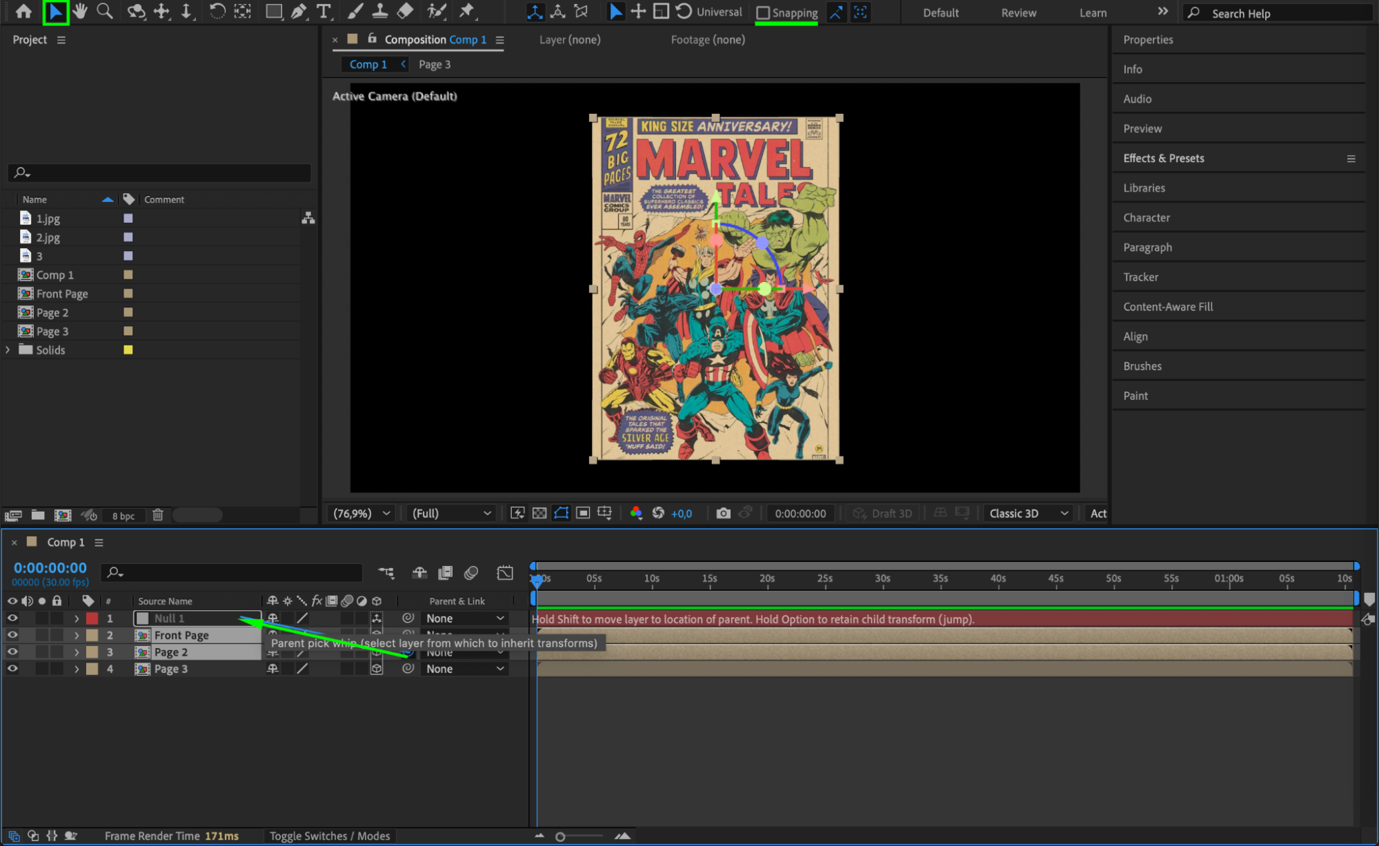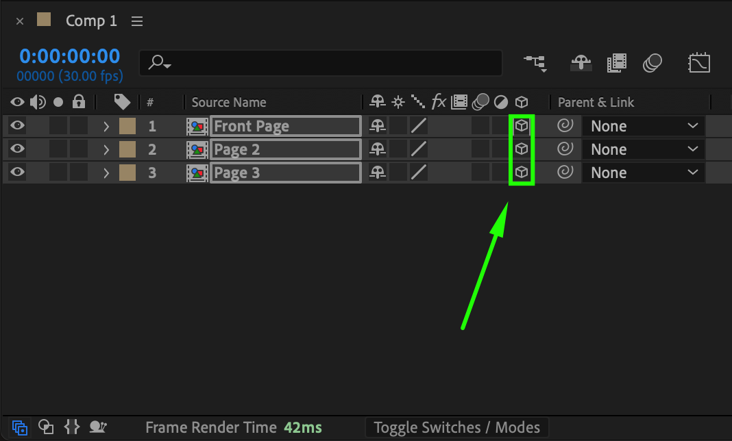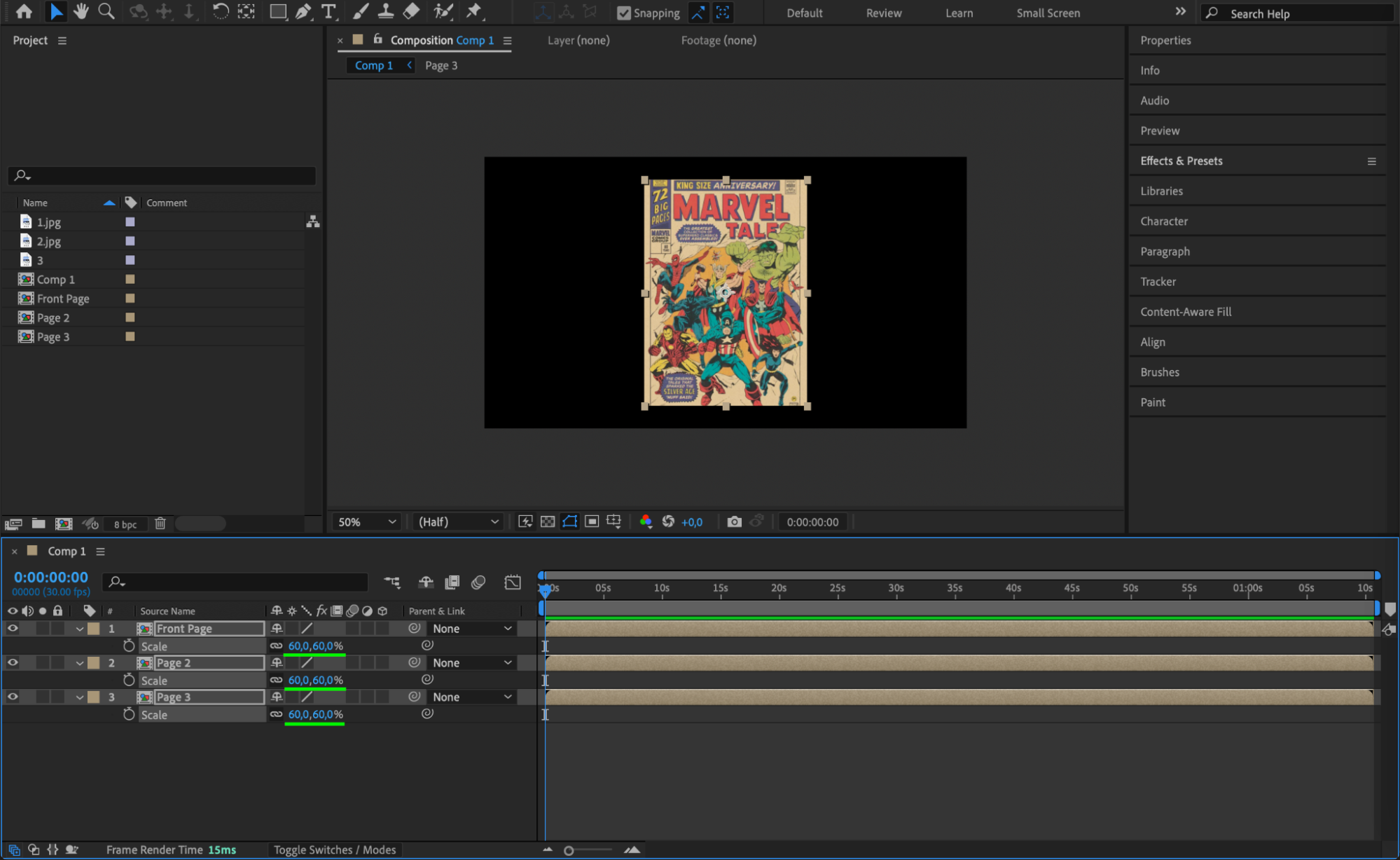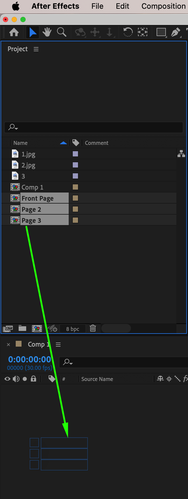 Drag the “Front Page”, “Page 2”, and “Page 3” compositions from the Project Panel onto the timeline of the “Comp 1” composition.