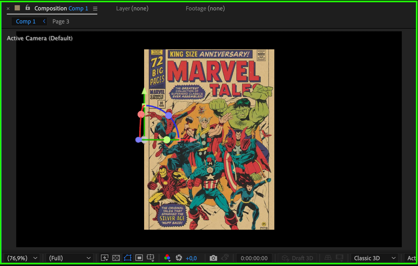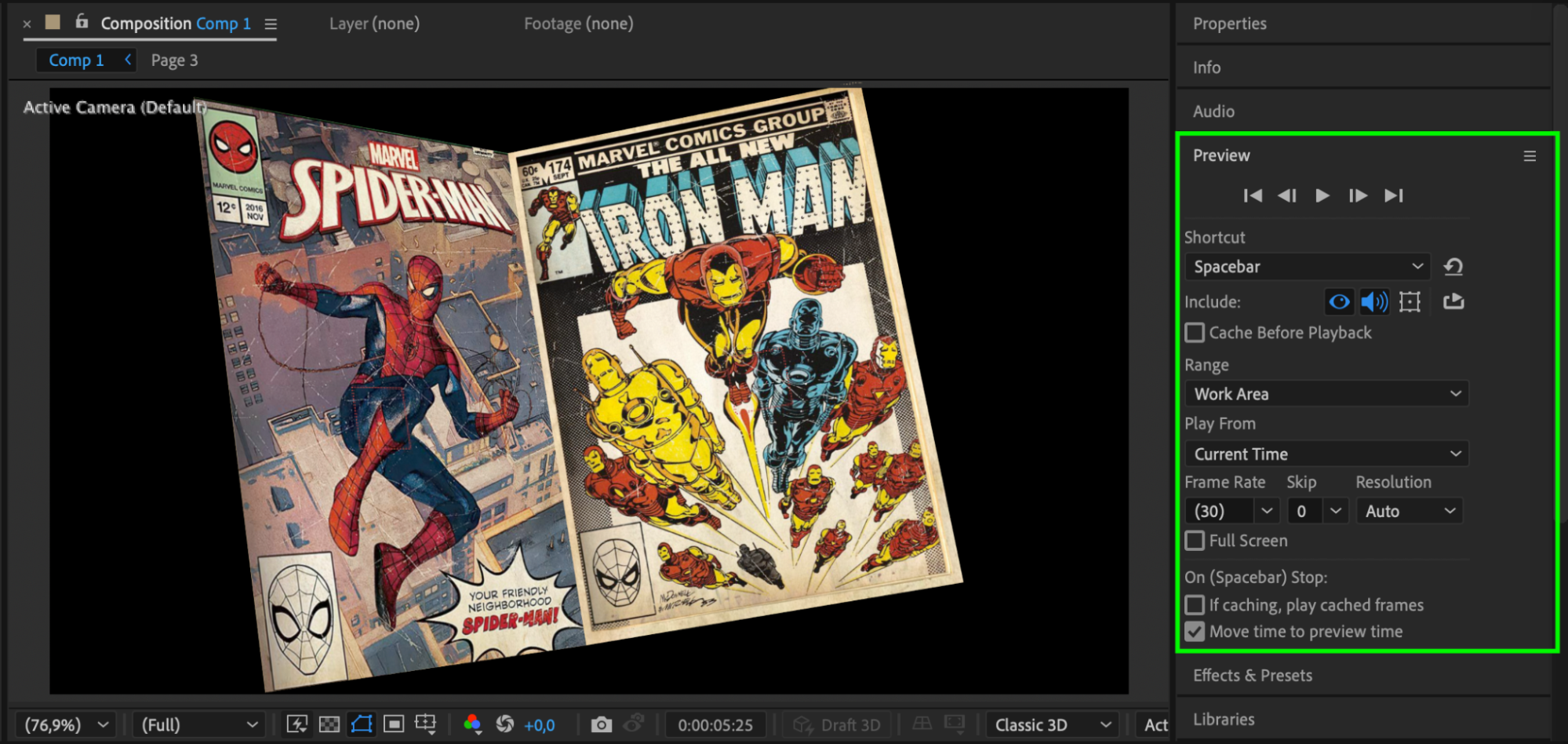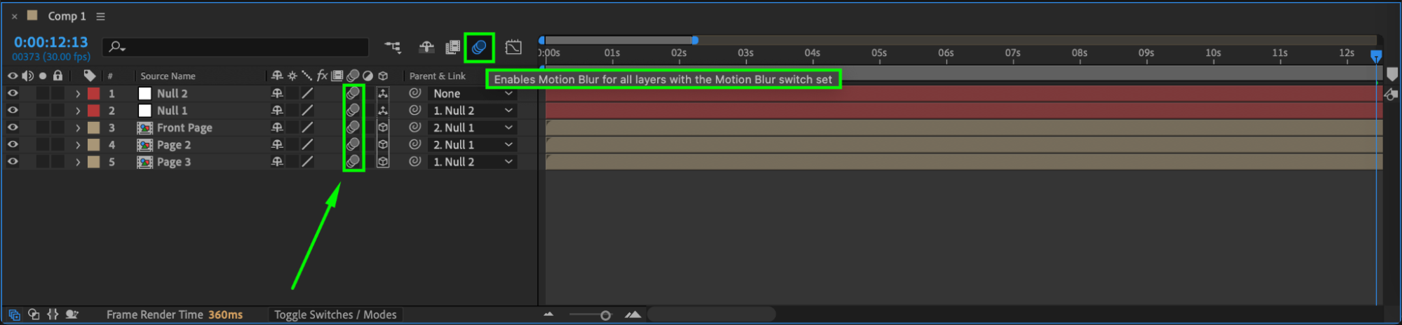 Select all page compositions in the timeline and enable the 3D Layer option to allow rotation and depth adjustments.