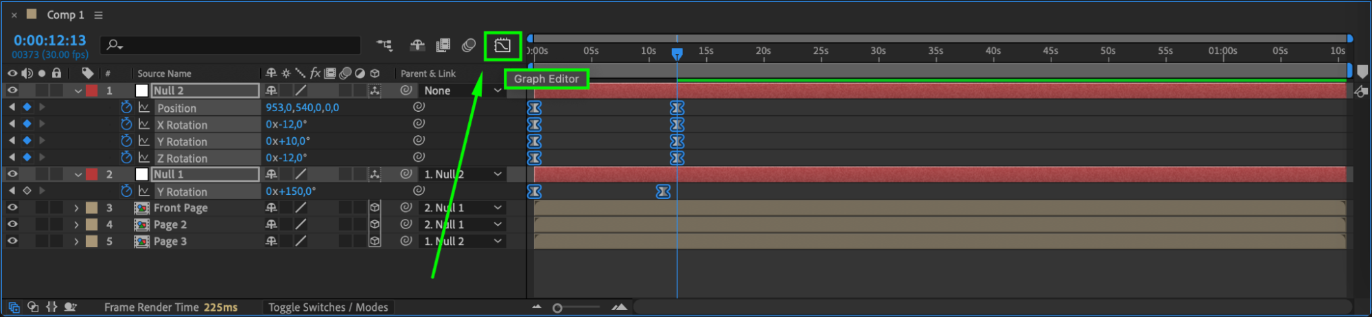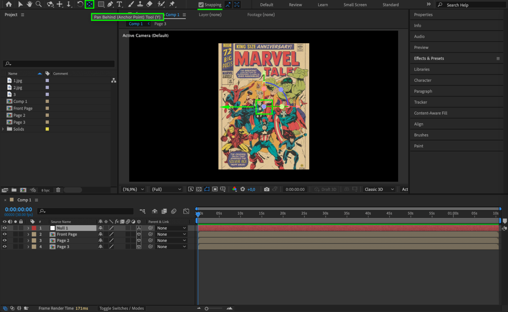 Use the Pan Behind Tool (Y) to move the anchor point of “Null 1” to the middle of the left edge of the front page. This will make the page rotate naturally from the spine of the book.