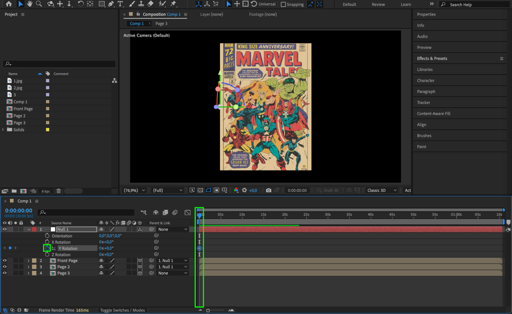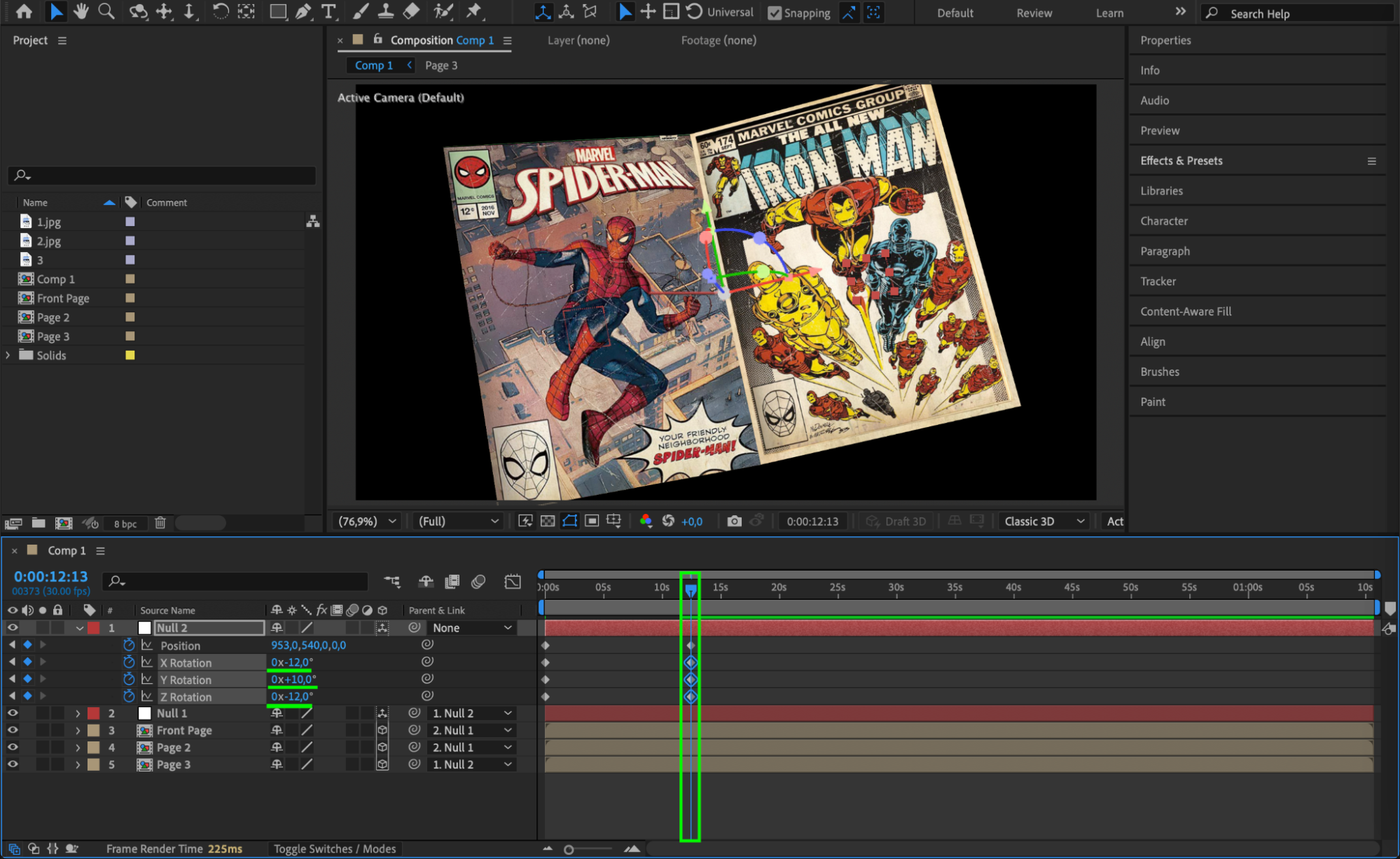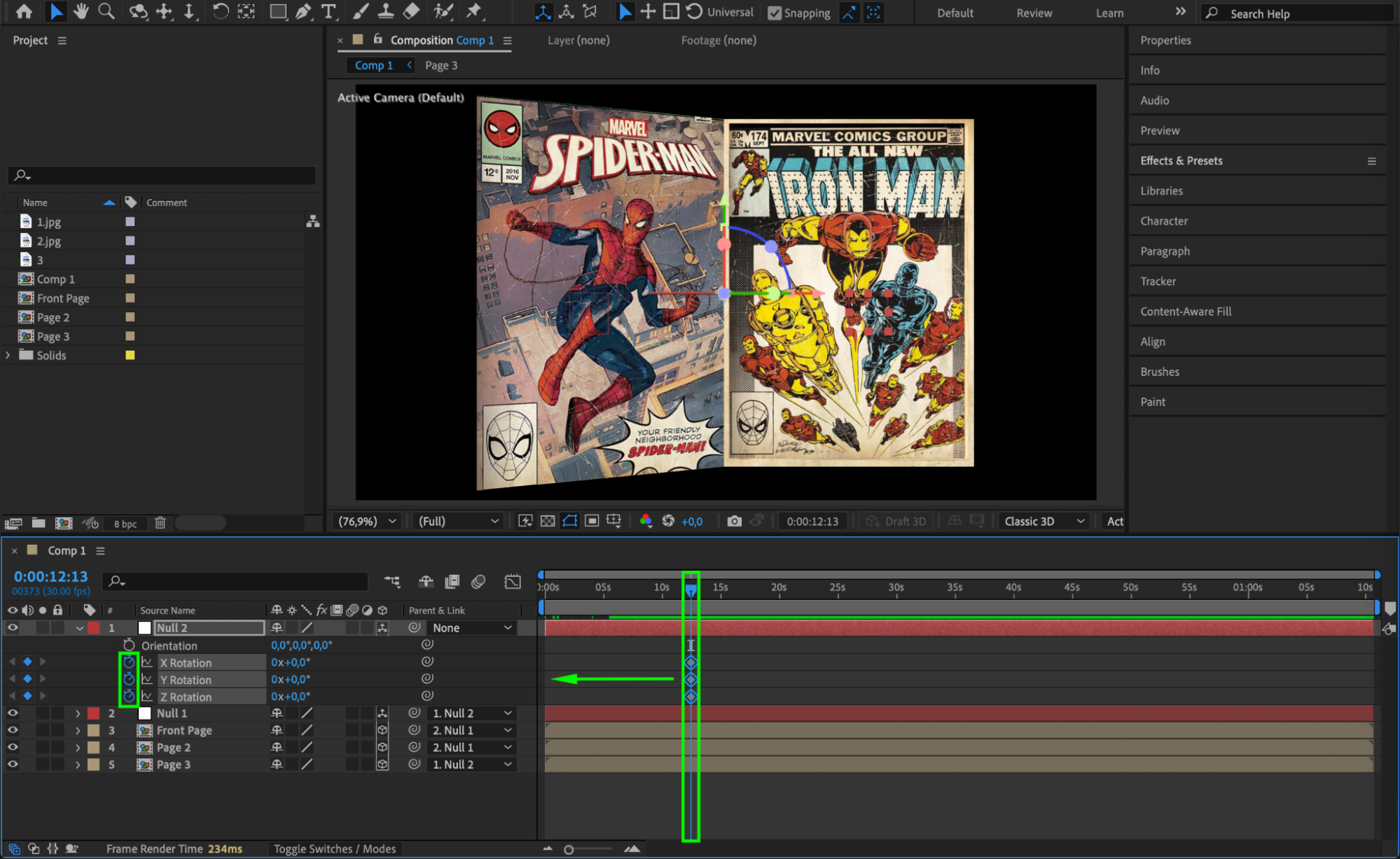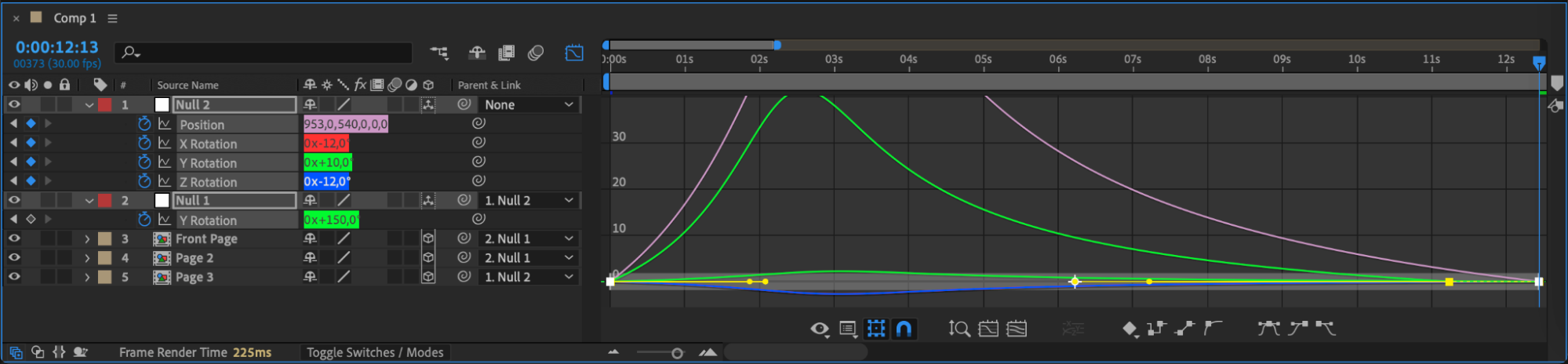 Move the CTI to the moment when the book is fully open, then click the stopwatch for X, Y, and Z Rotation in Null 2 to create keyframes.