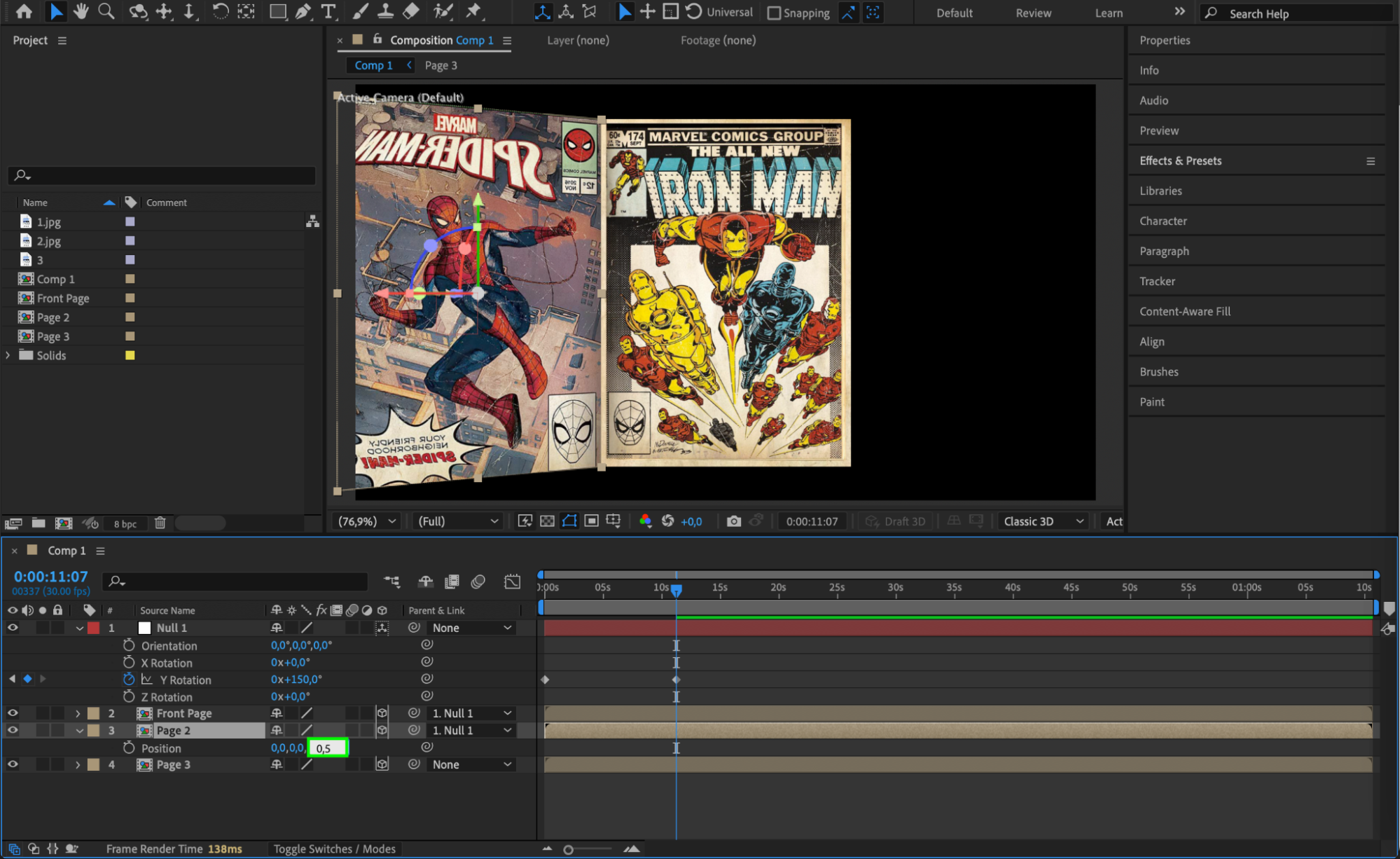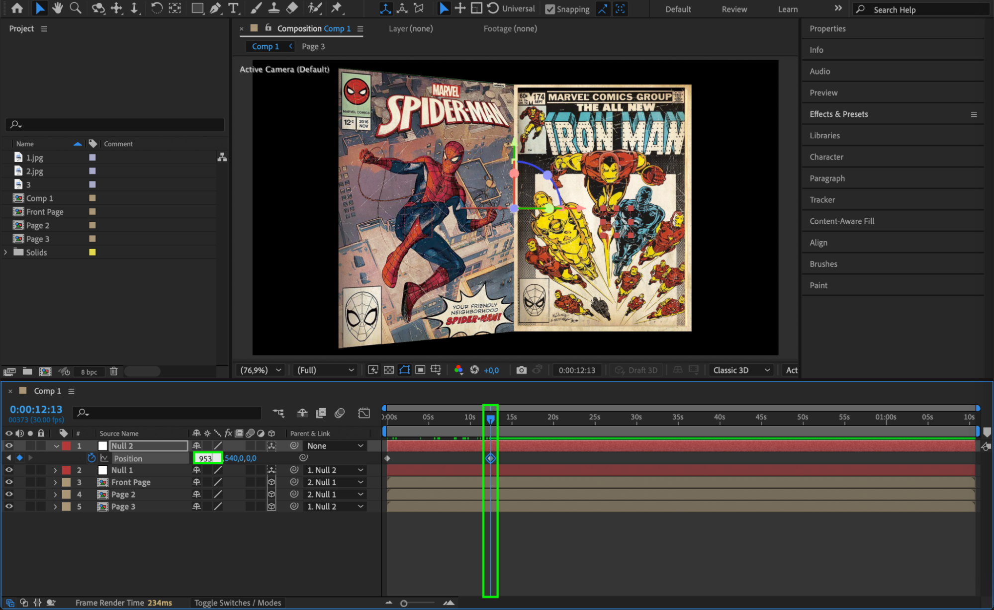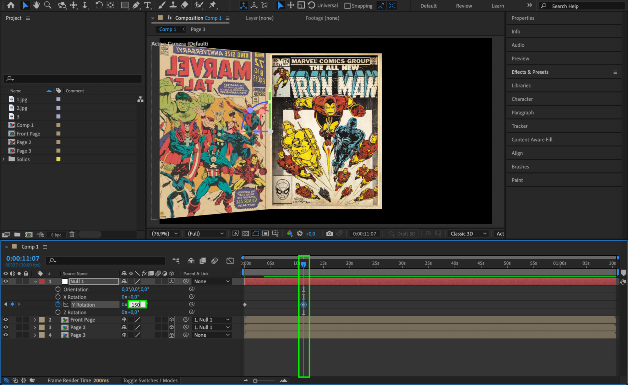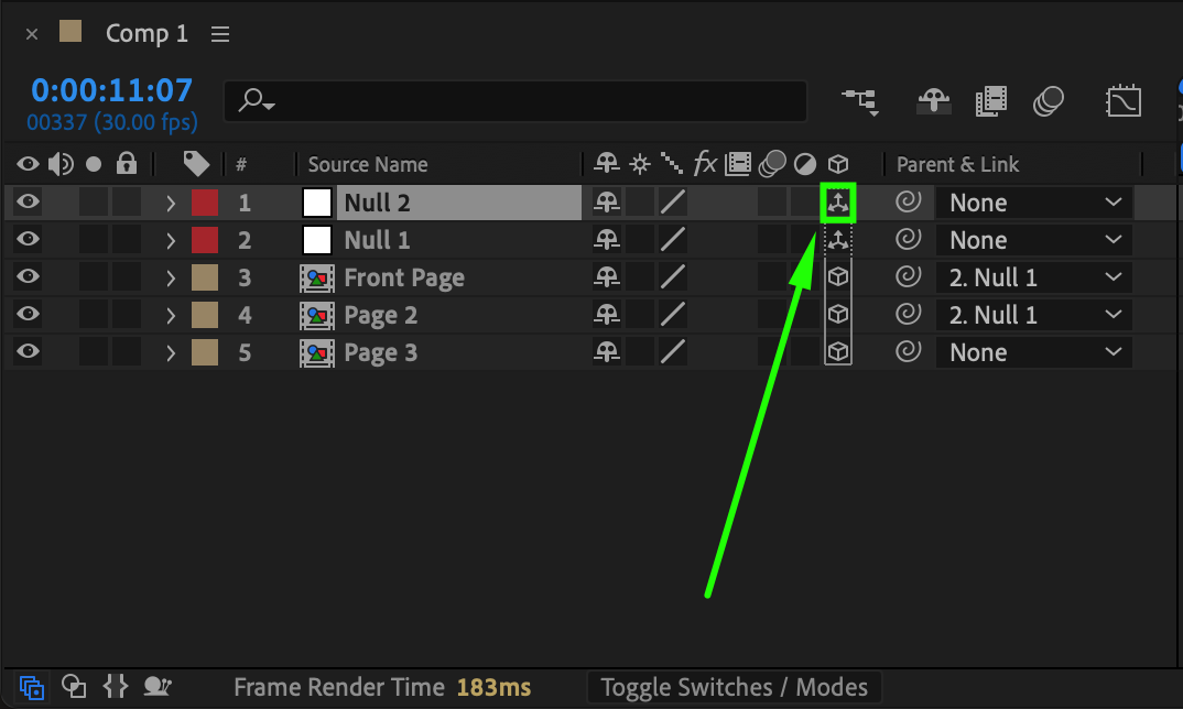Go to Layer > New > Null Object and make it 3D. Name it “Null 1” – this will control the flipping of the first page.