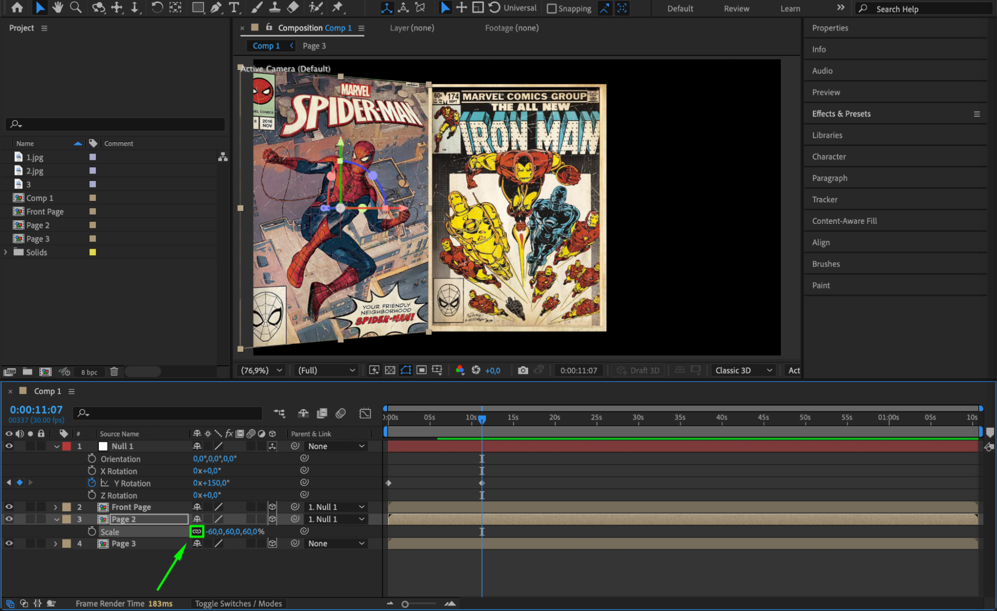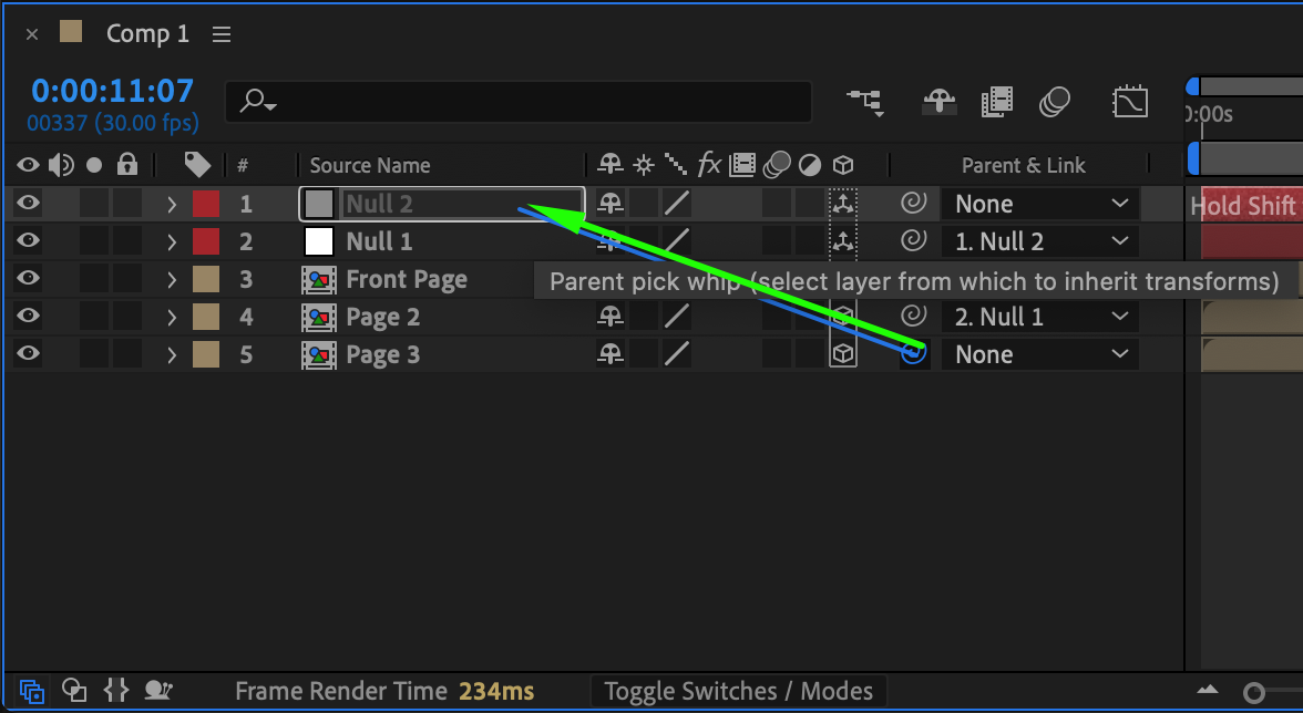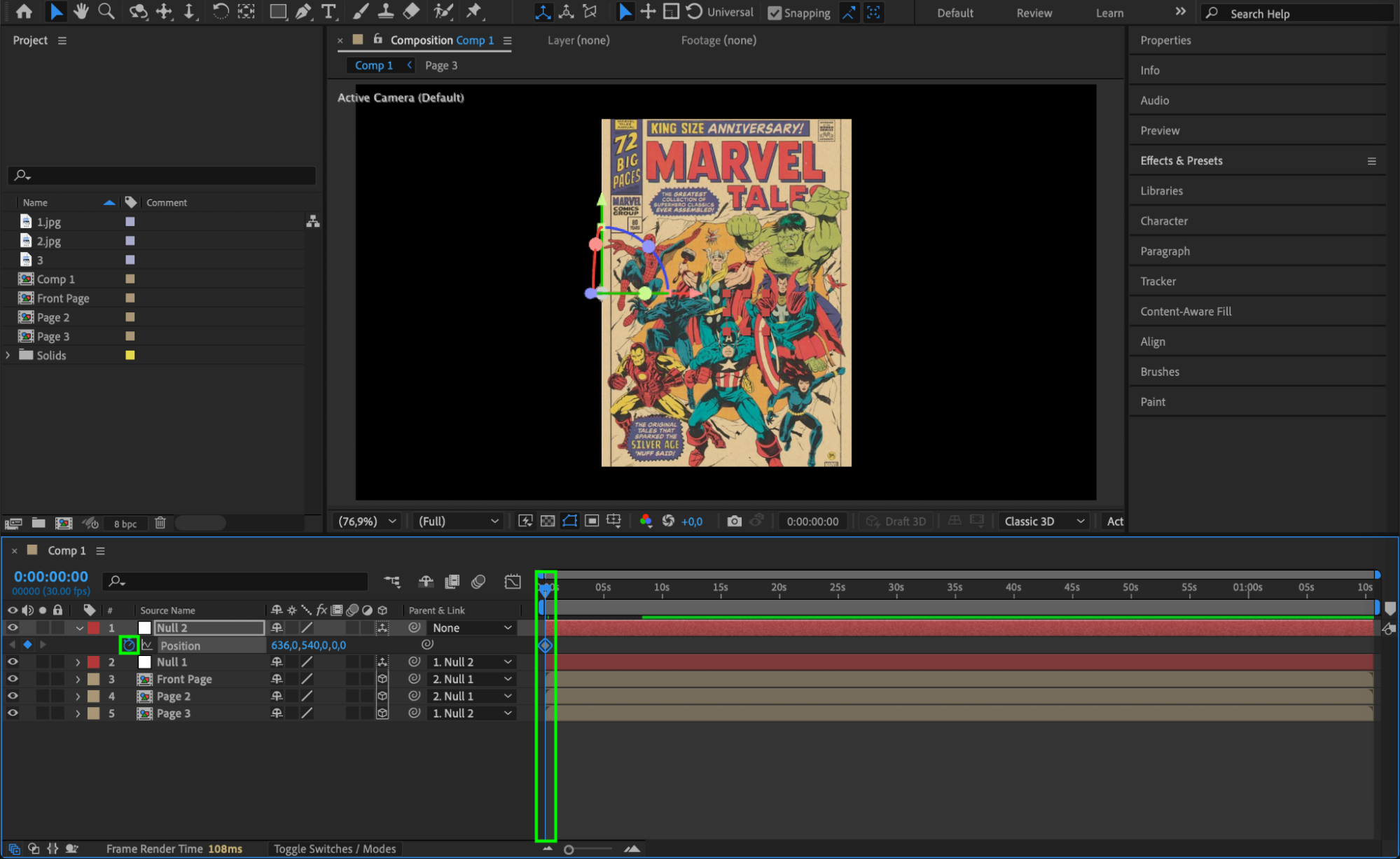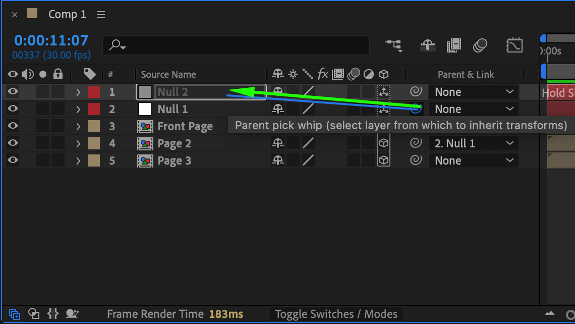 Go to Layer > New > Null Object and make it 3D. Name it “Null 1” – this will control the flipping of the first page.