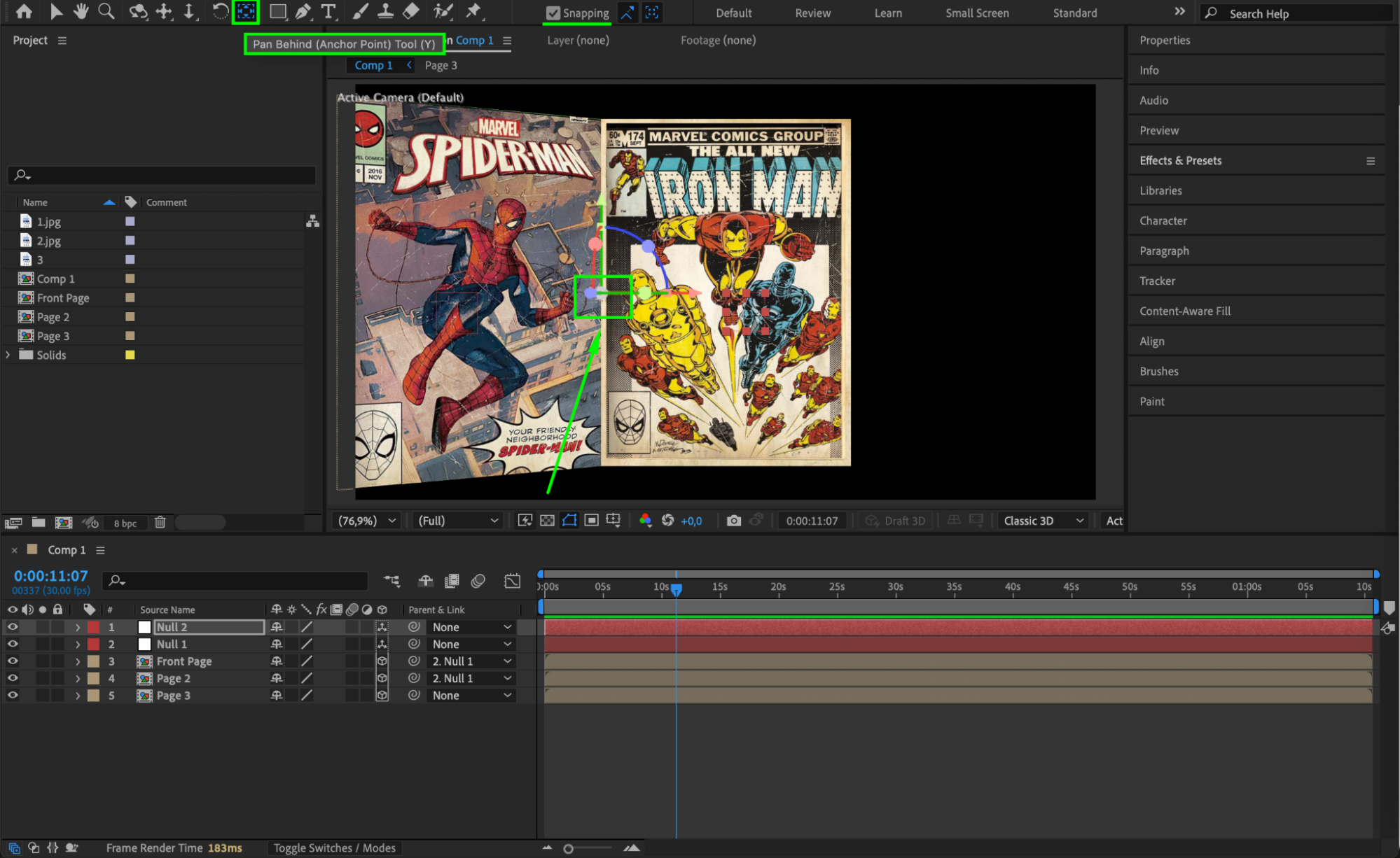 Use the Pan Behind Tool (Y) to move Null 2’s anchor point to the spine of the open book, where the pages meet.