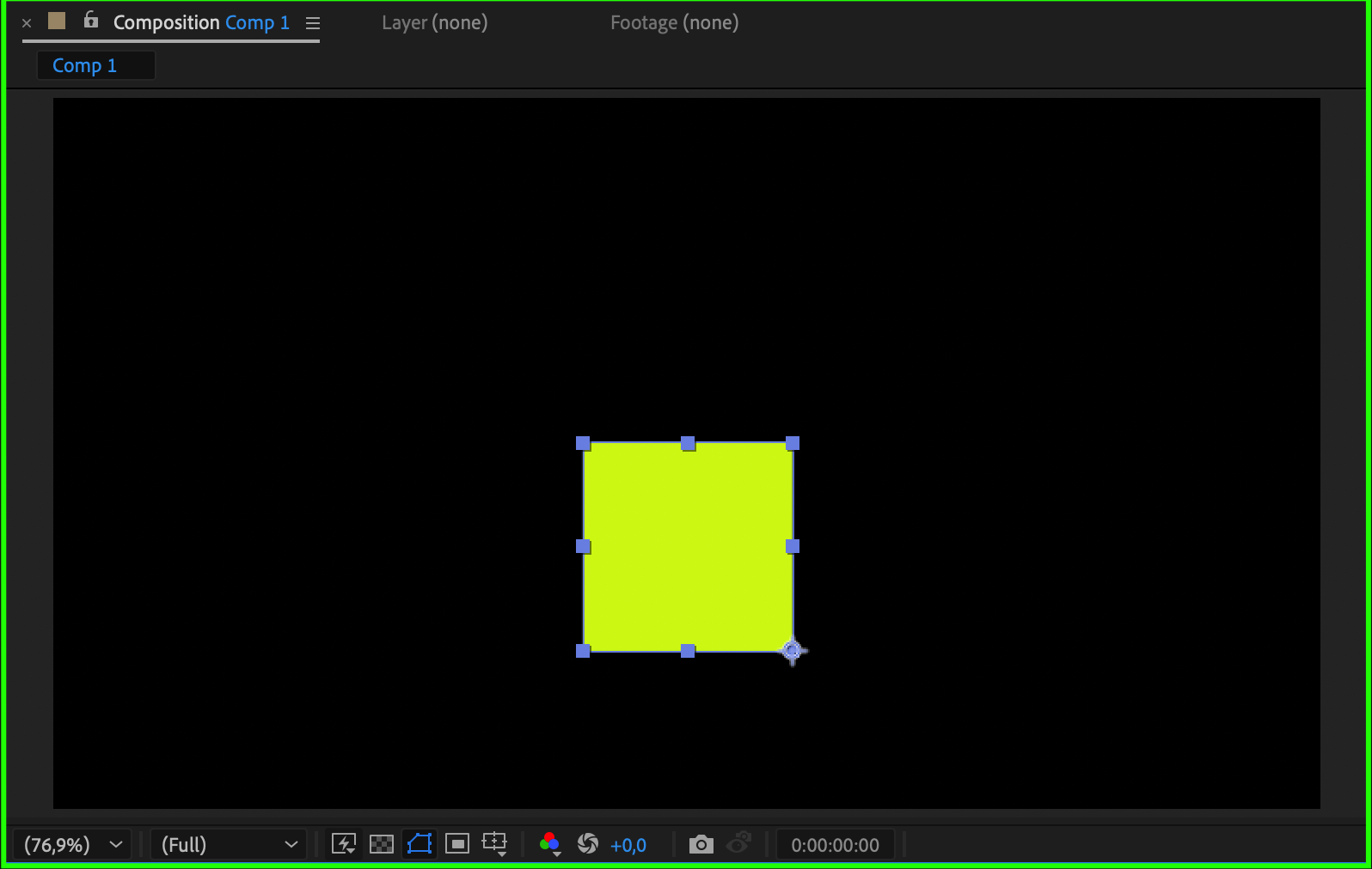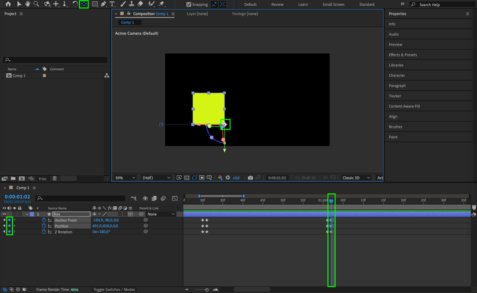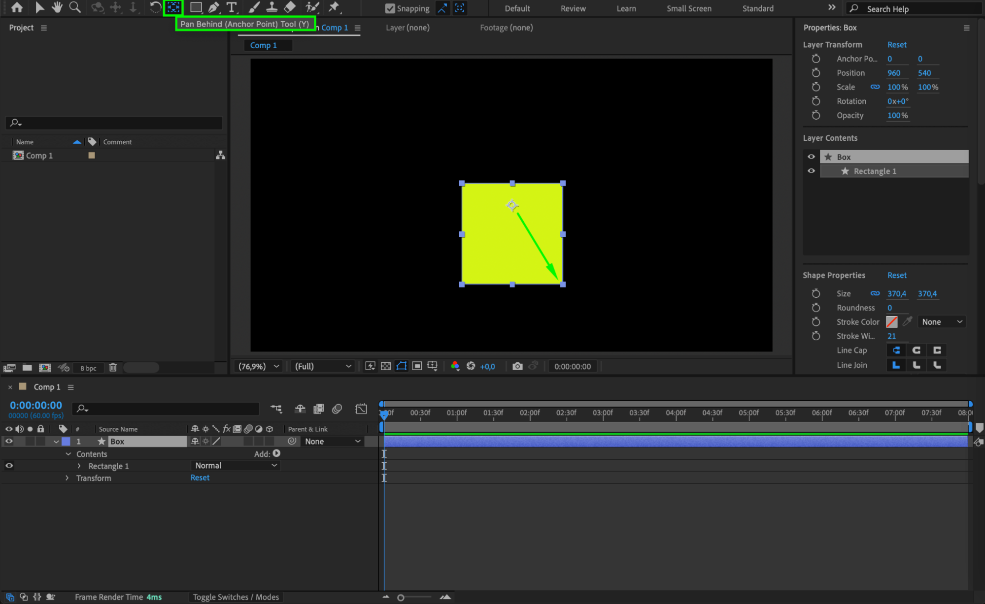 Use the Pan Behind Tool (Y) to move the anchor point to the bottom-right corner of the box. This will serve as the pivot point for rotation and movement.