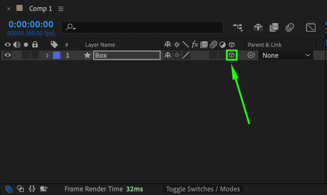 In the Timeline panel, enable the 3D switch for the shape layer. This allows you to manipulate the box in three dimensions, adding depth to the animation.