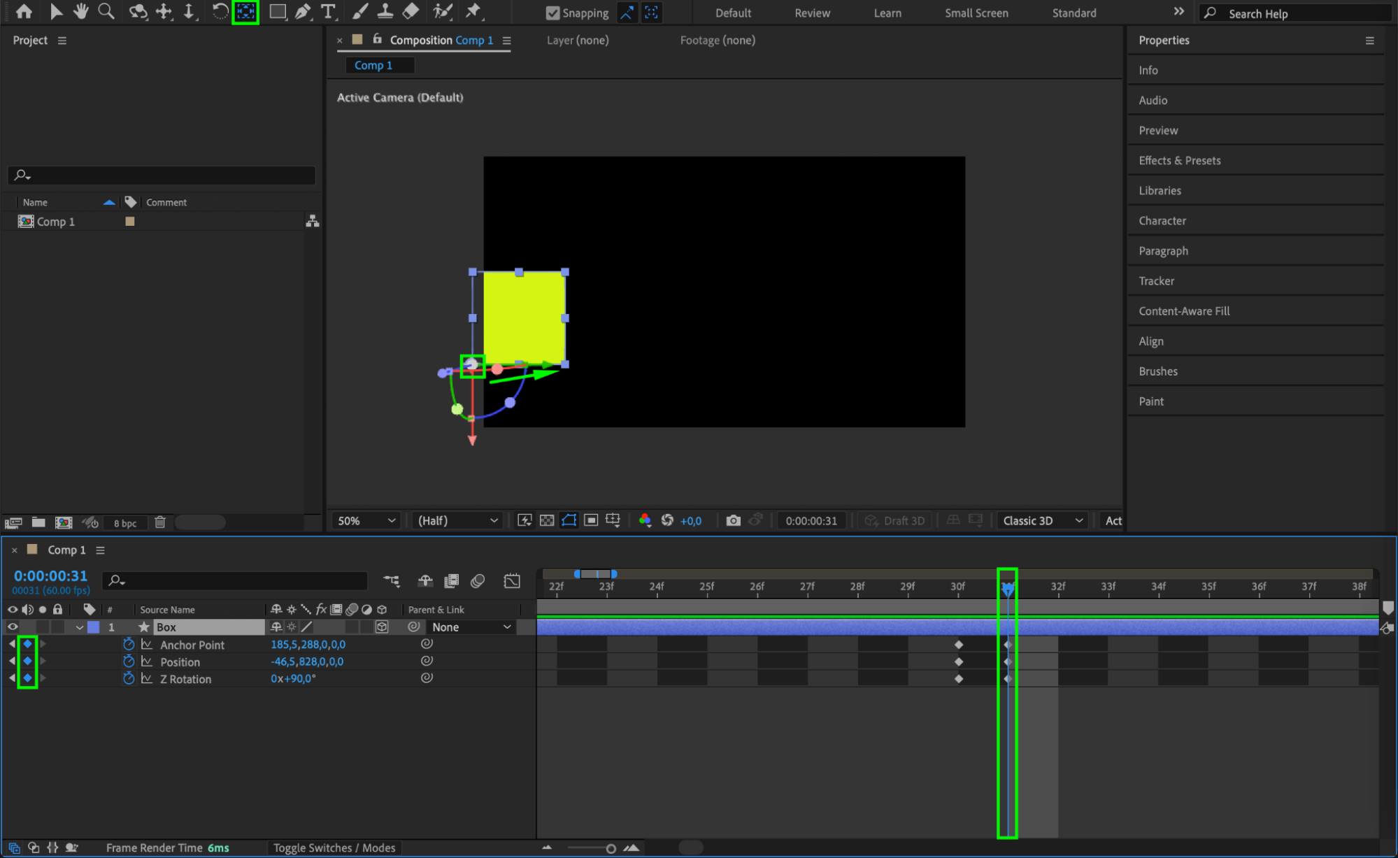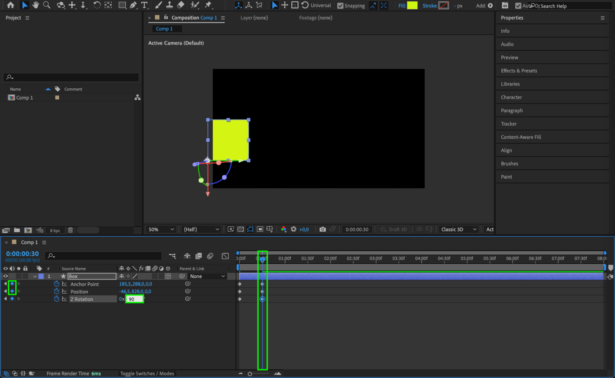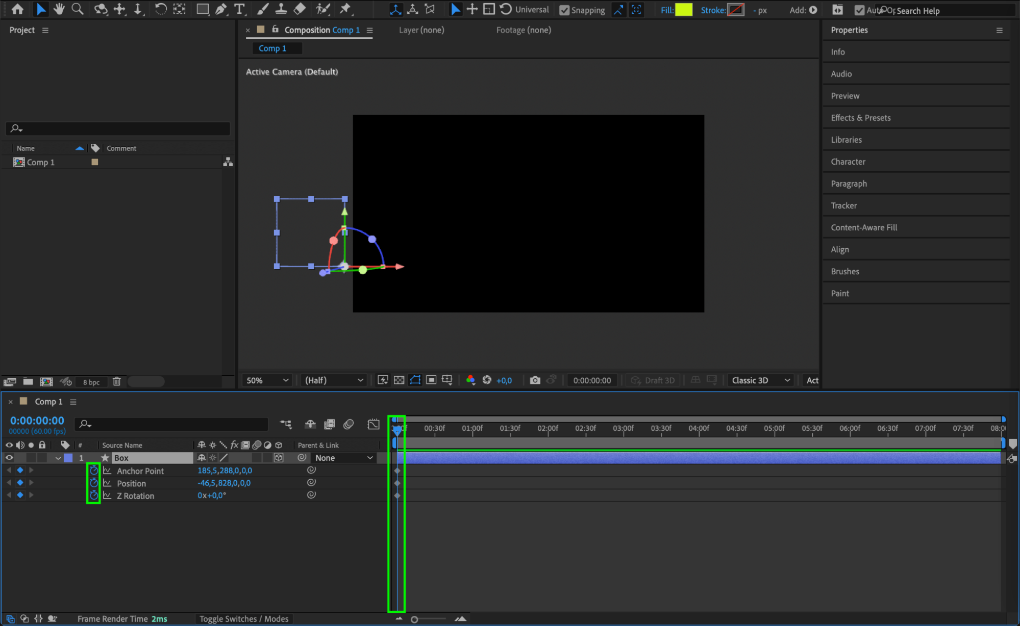 Expand the Transform properties and click the stopwatch icons for Position, Anchor Point, and Z Rotation when the box is positioned off-screen to the left. This marks the starting point of the animation.