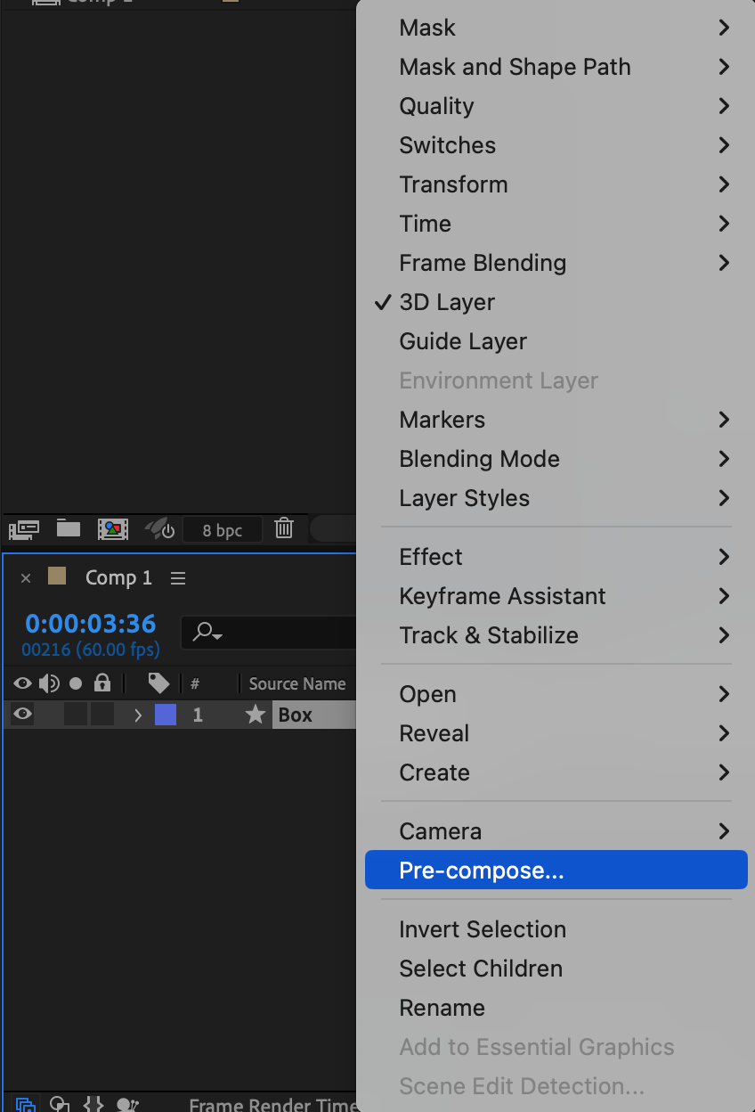 Select the animated layer and right-click on it. Choose Pre-compose to group all transformations into a single composition, making it easier to manage.