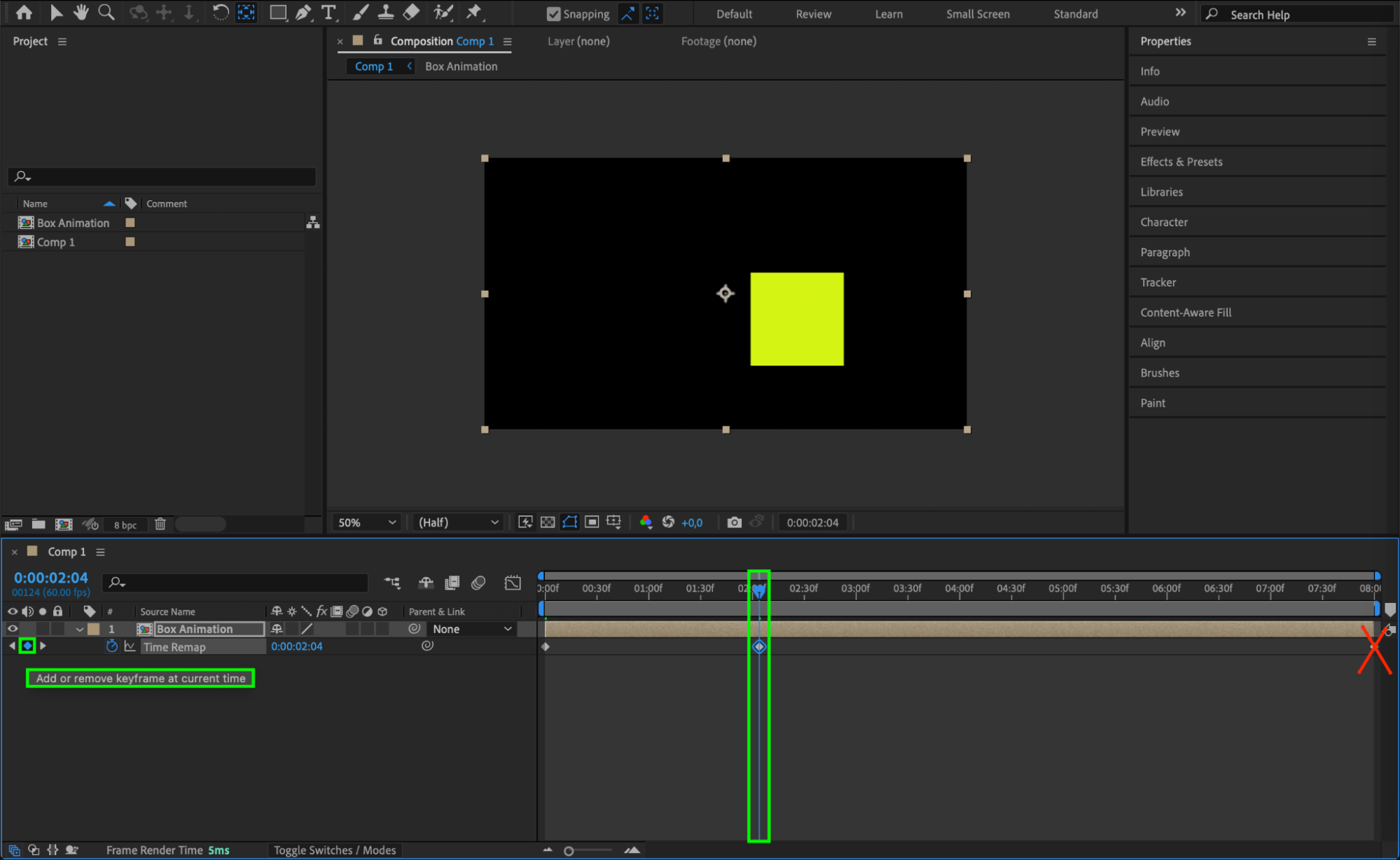 Move the CTI to the desired ending position of the box animation. Click the diamond icon to create a new keyframe, then delete the automatically generated final keyframe to maintain smooth movement.