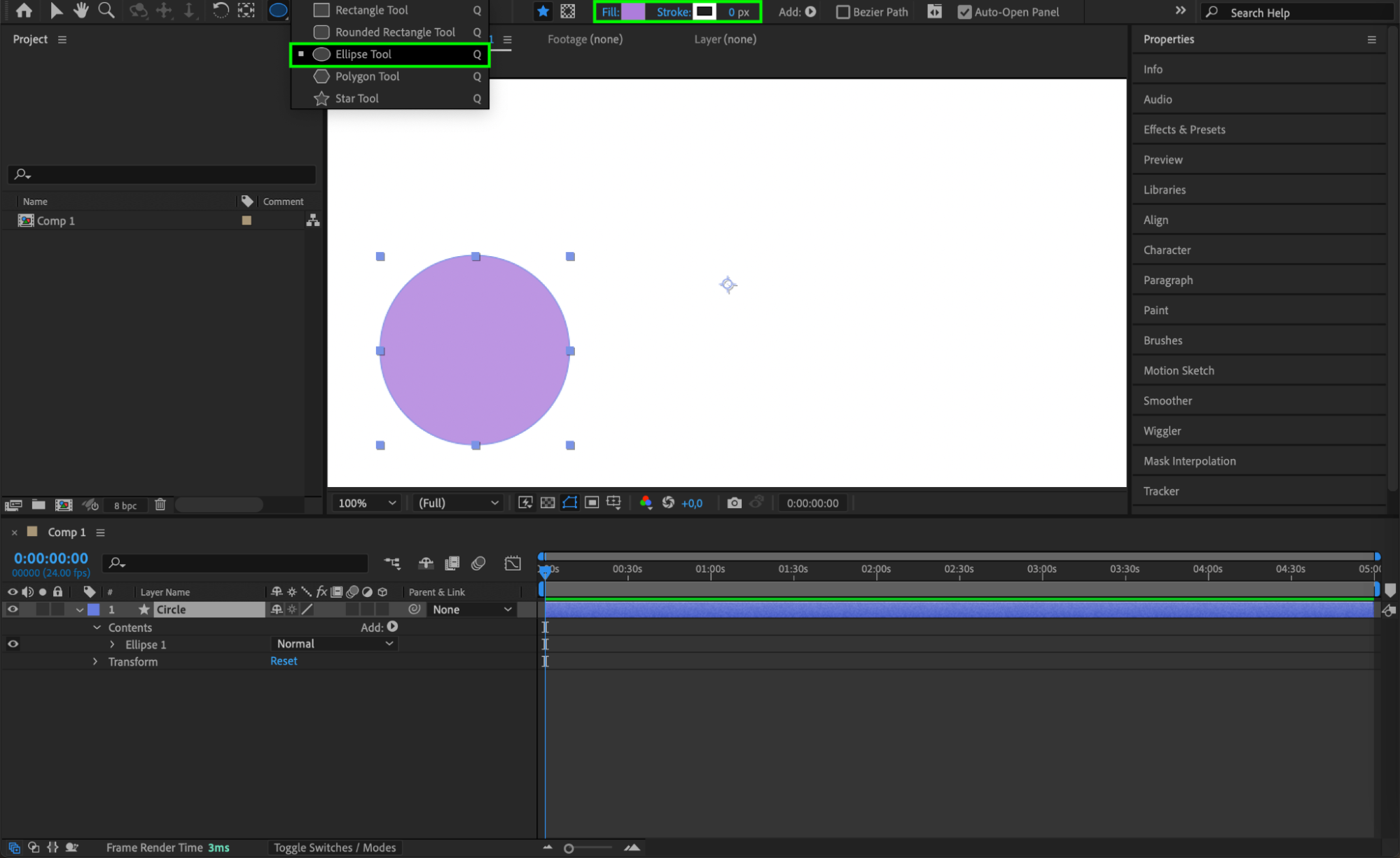 Select the Ellipse Tool from the toolbar or use the shortcut “Q”. Click and drag on the composition panel to create a circle. If you want a perfect circle, hold down the “Shift” key while drawing. Once created, rename the layer “Circle” by clicking on it and pressing Enter. This keeps your timeline organized.