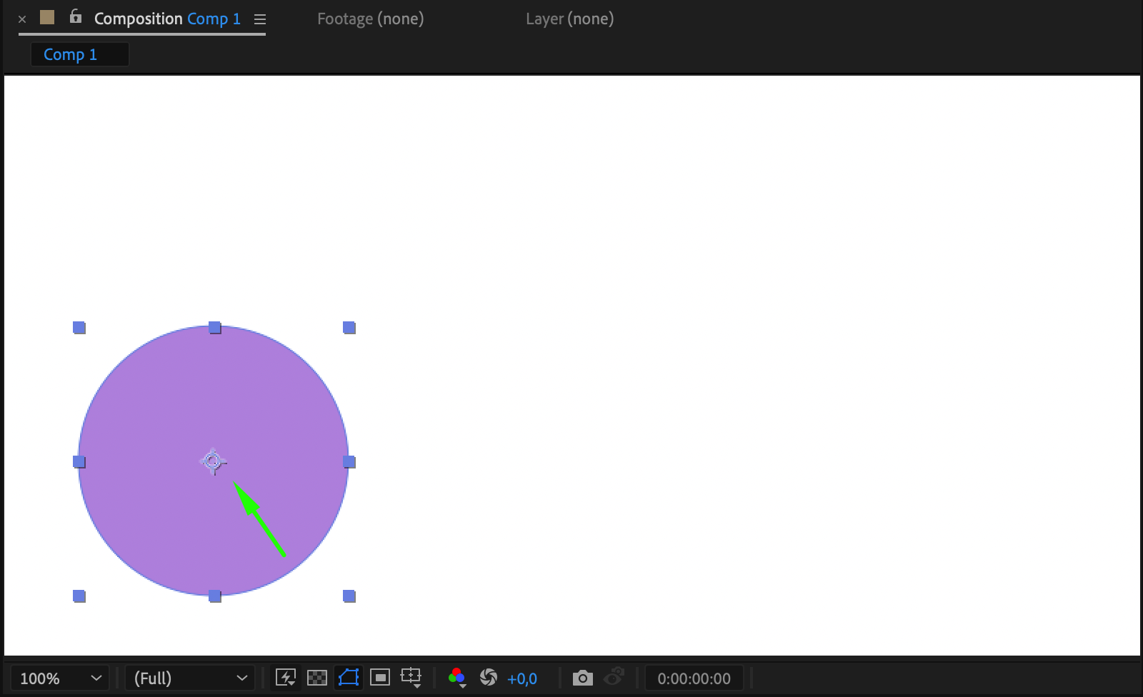 To animate the circle smoothly, ensure the anchor point is centered. With the circle layer selected, go to Layer > Transform > Center Anchor Point in Layer or press “Ctrl/Cmd + Alt + Home”. This centers the anchor point, allowing for more balanced rotation and scaling animations.