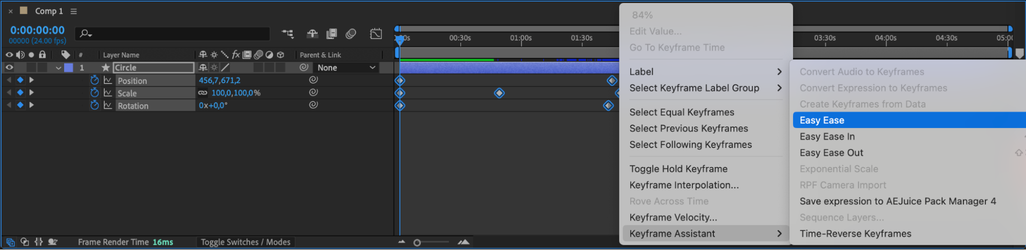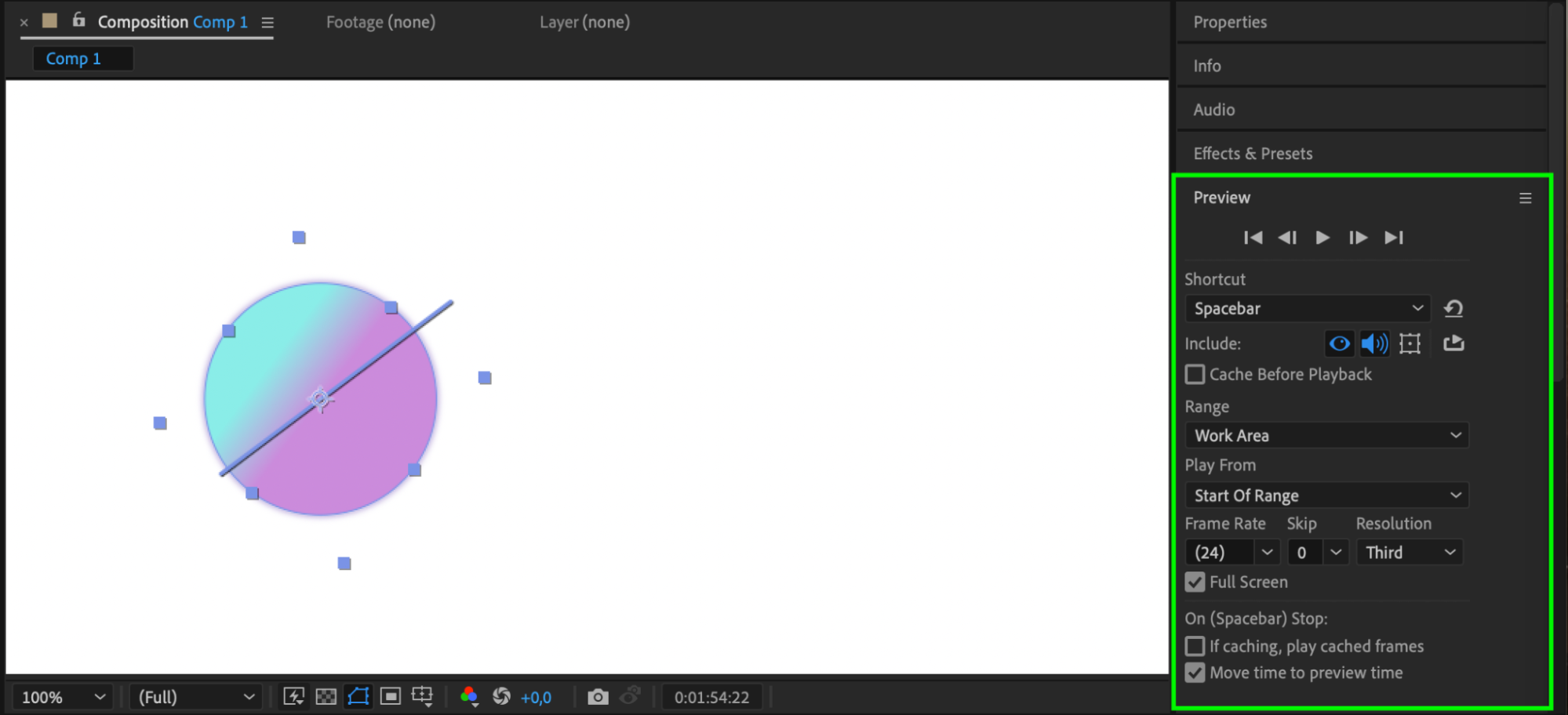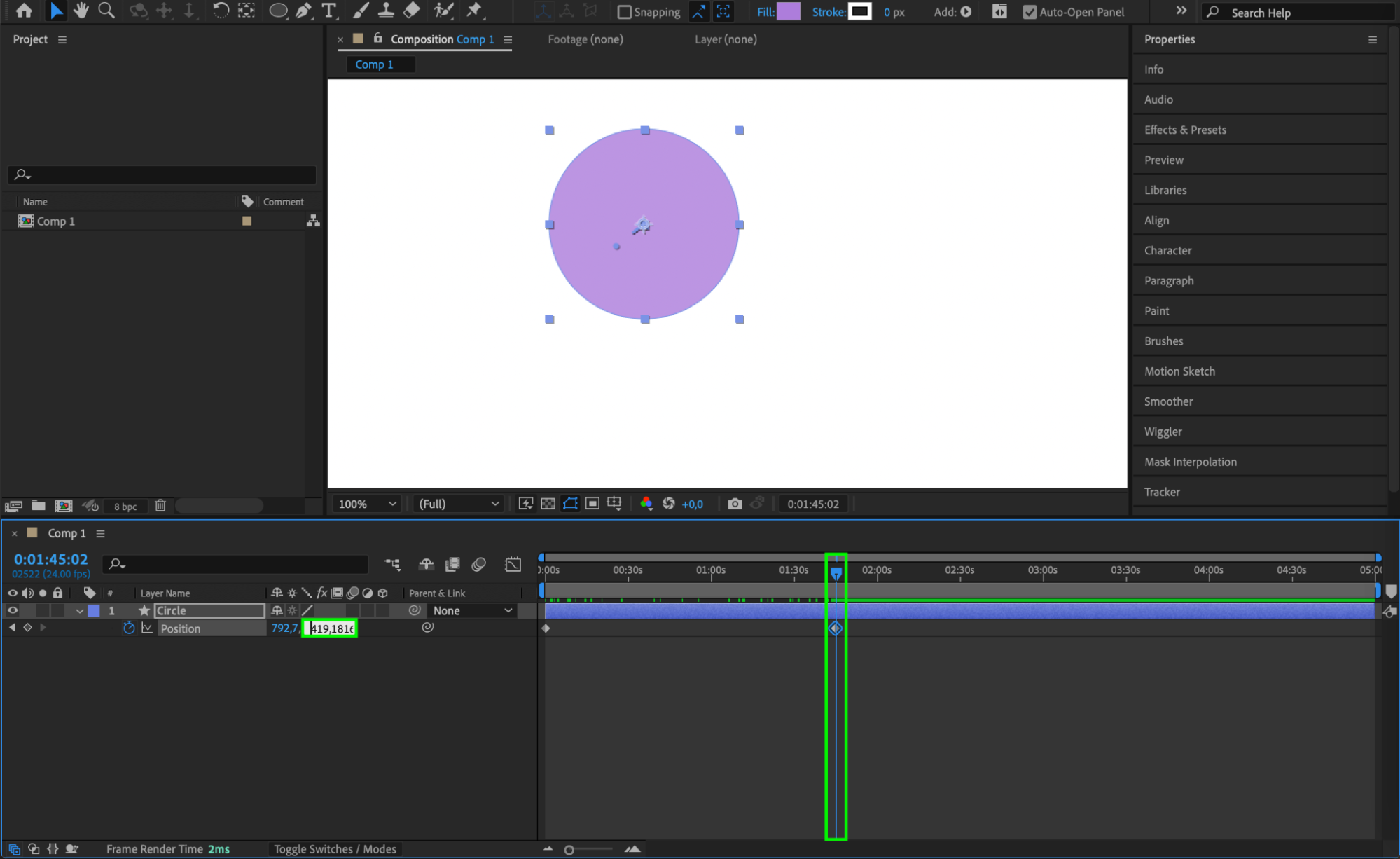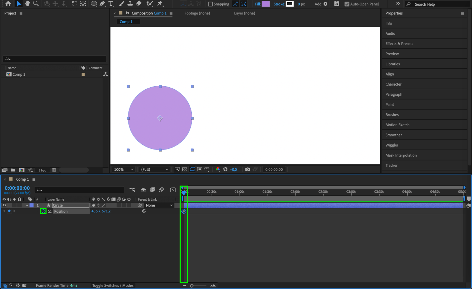 To animate the circle’s movement, select the circle layer and press “P” to open the Position property under Transform. Click the stopwatch icon next to Position to create a keyframe. Move the Current Time Indicator (CTI) to another point on the timeline, then adjust the circle’s position to set a second keyframe. The circle will now move between these two points.