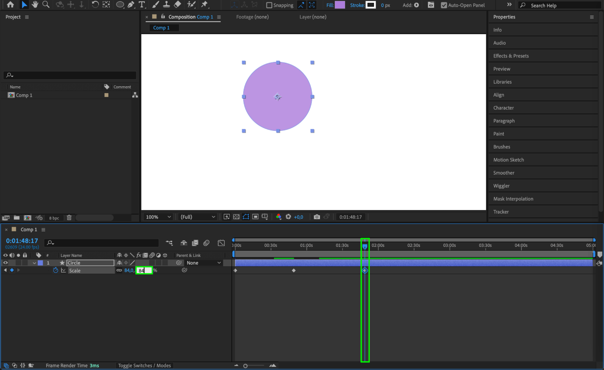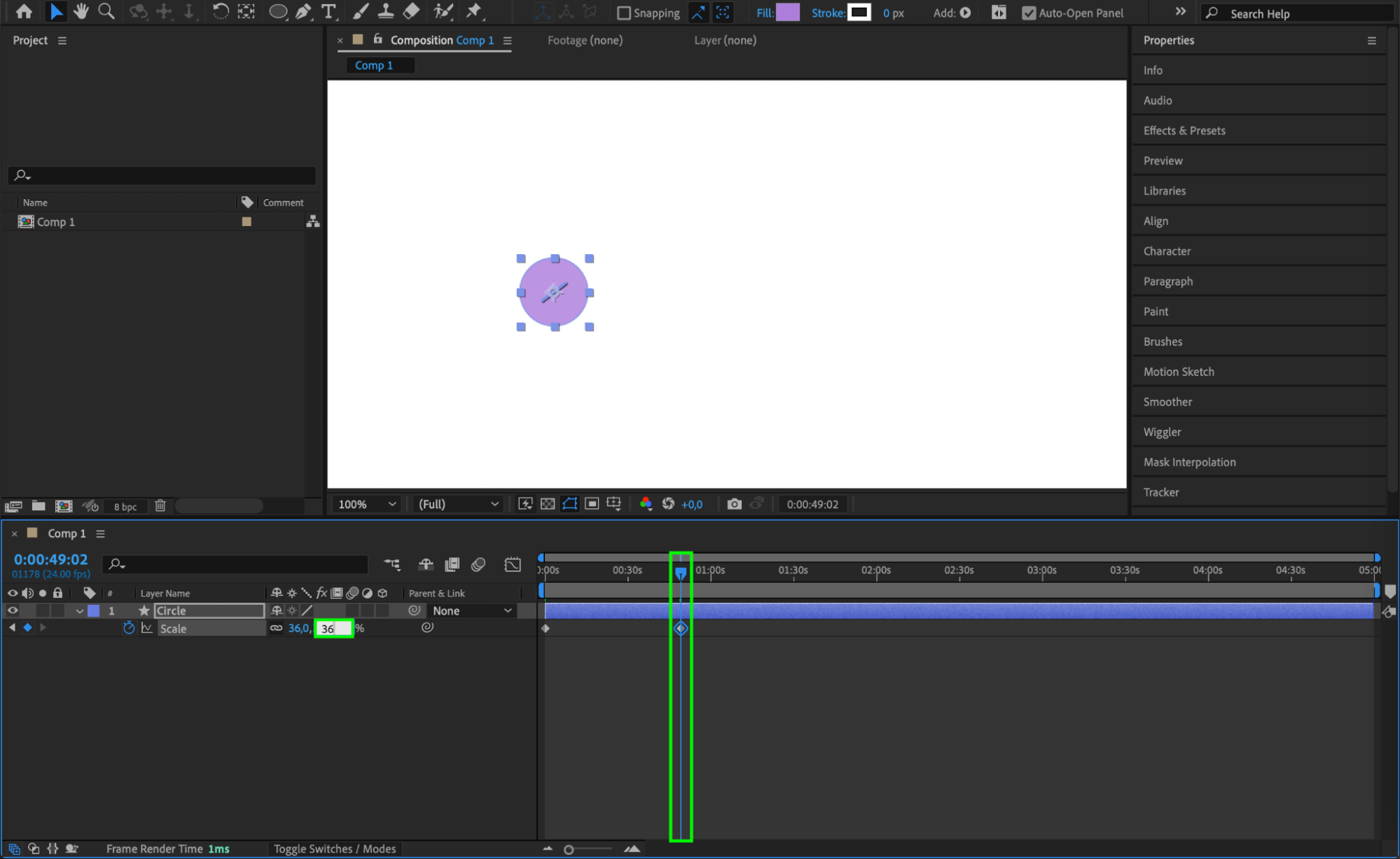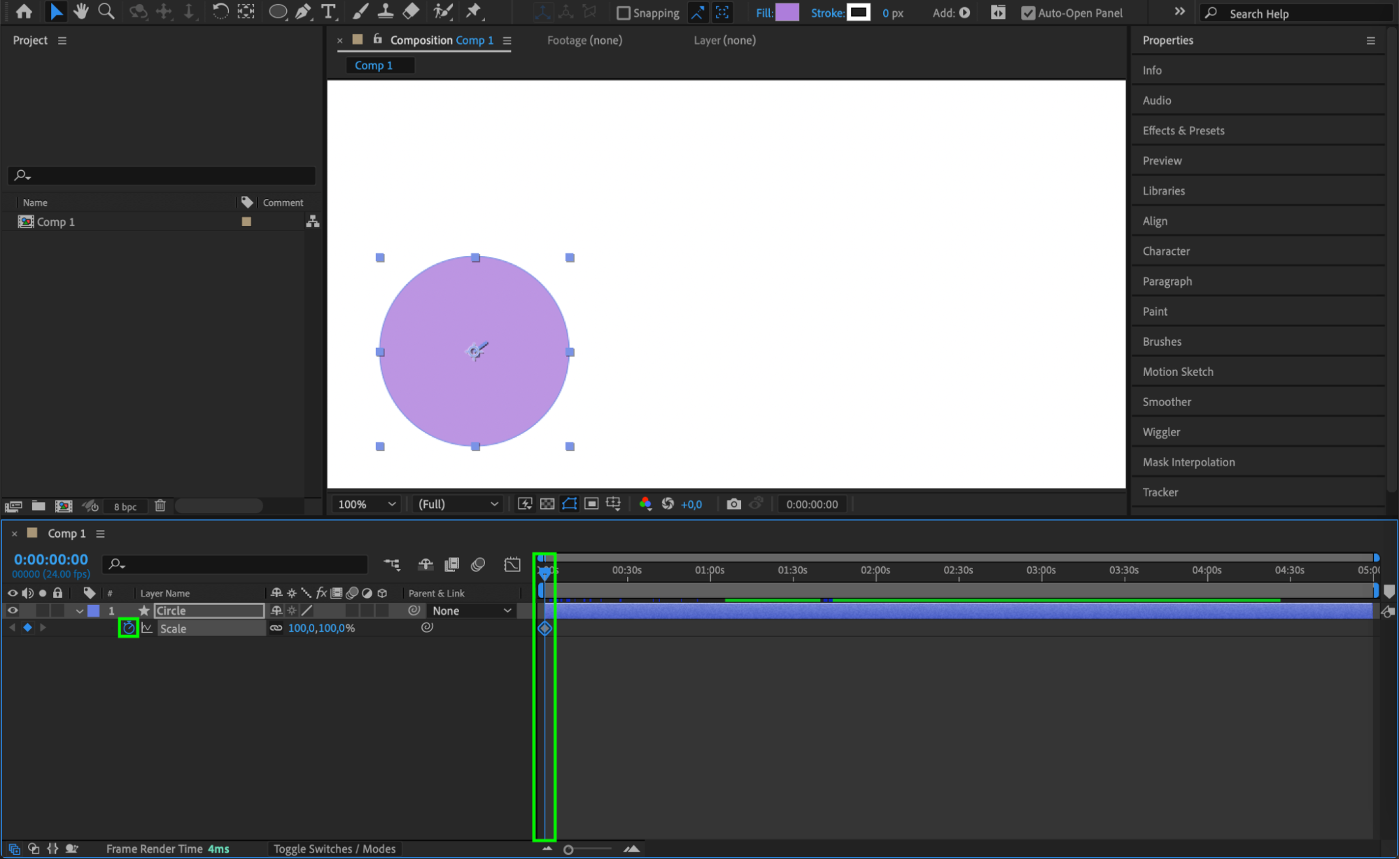 To add scale animation, press “S” to open the Scale property. Click the stopwatch icon to set a keyframe at the circle’s starting point. Move the CTI to another time and adjust the scale percentage. This scaling effect is useful for creating breathing or pulsating animations.