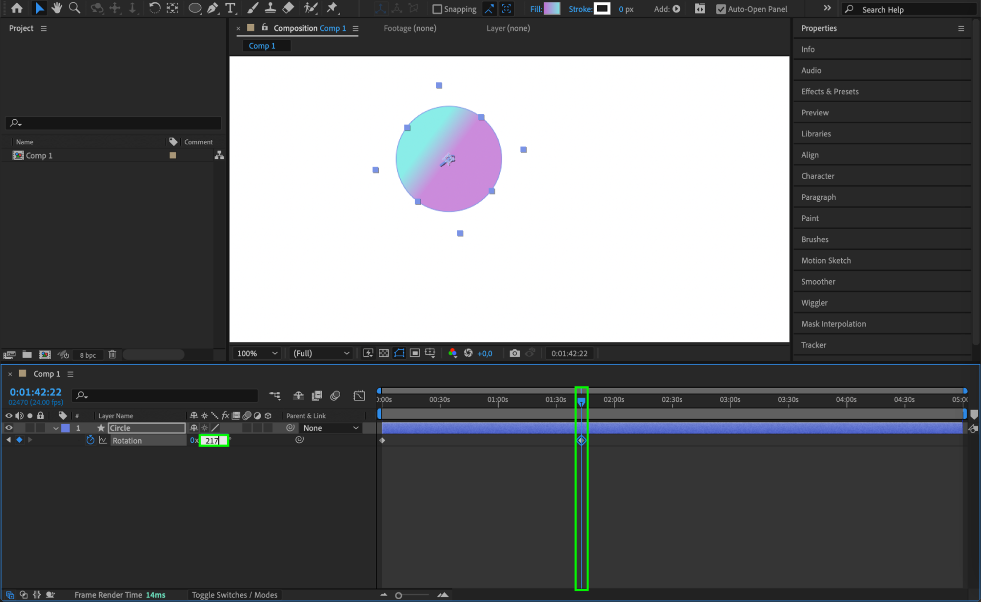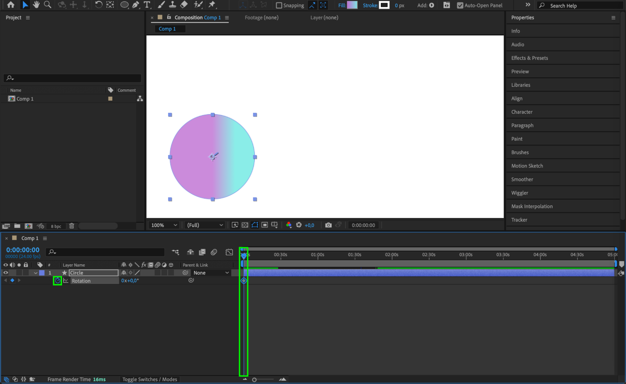 If you’d like to add rotation, press “R” to reveal the Rotation property. Set a keyframe by clicking the stopwatch icon, then move the CTI forward and increase the rotation value. For example, setting it to 1x will make the circle complete one full rotation over the selected time period. This adds dynamic movement to your animation.