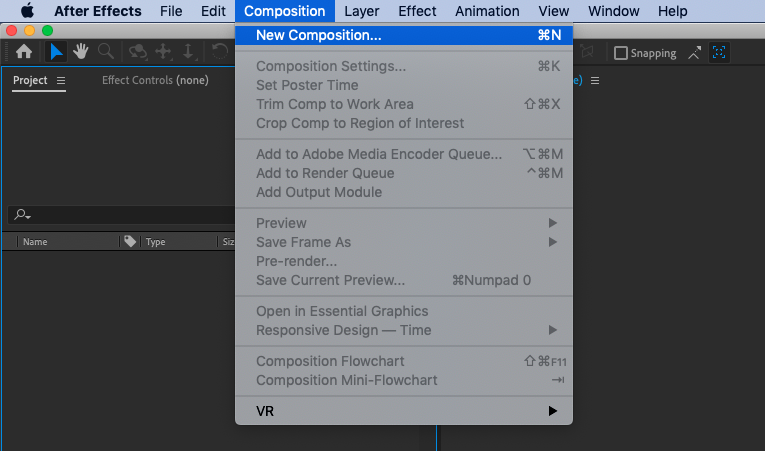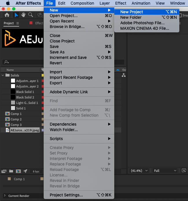 Open After Effects and create a new project by going to File > New > New Project or using the shortcut Ctrl + Alt + N on Win or Command + Option + N on Mac.