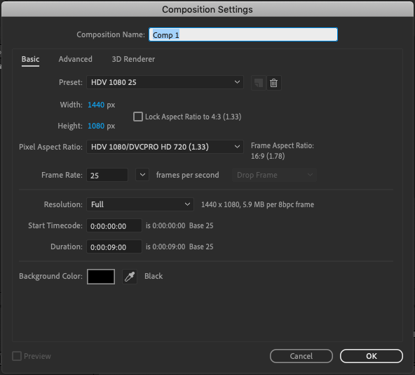 Set the desired width, height, and frame rate for your animation in the Composition Settings window and hit OK.