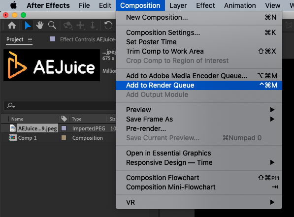 Render the composition by going to Composition > Add to Render Queue or using the shortcut Ctrl + M on Win or Command + Ctrl + M on Mac.