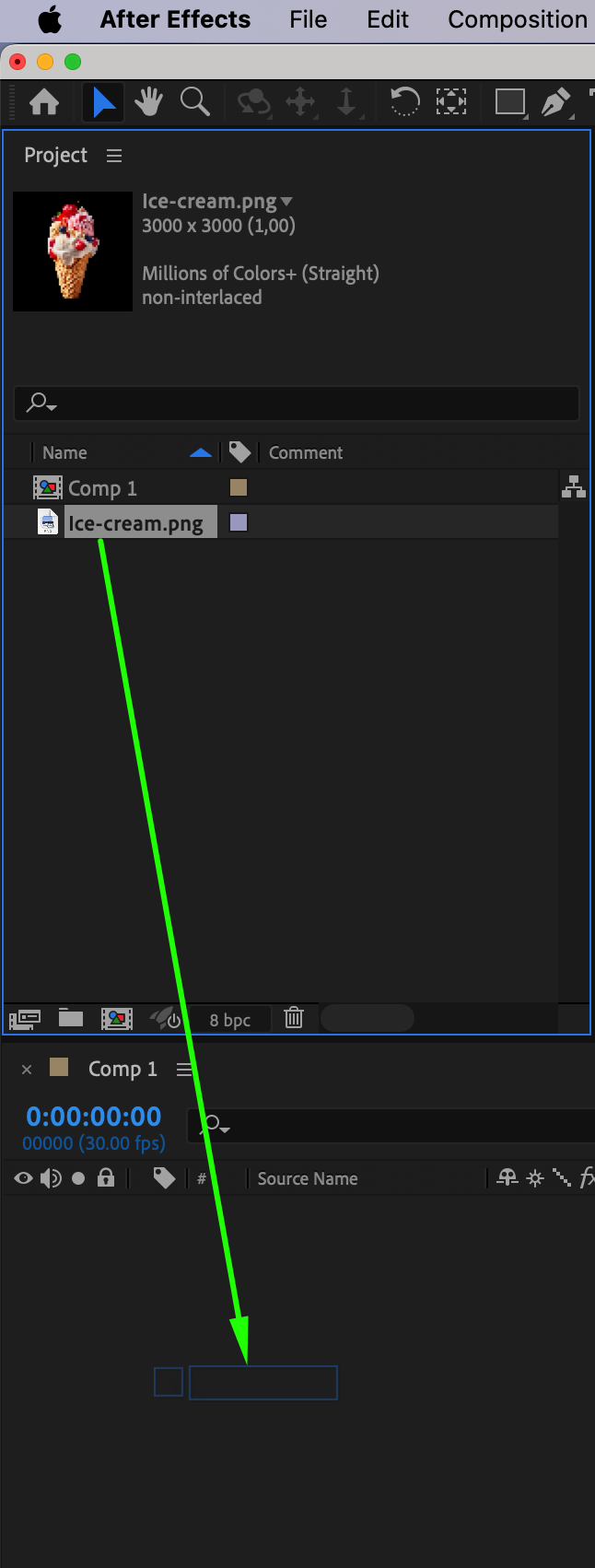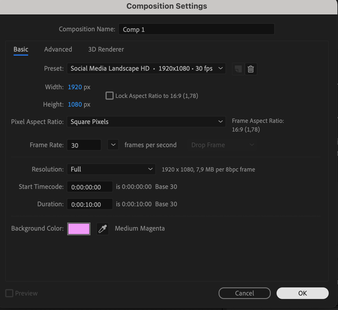 Open After Effects and go to Composition > New Composition. Set the resolution to 1920×1080 pixels, frame rate to 30 fps, and duration to 10 seconds. Choose a background color that complements your image.