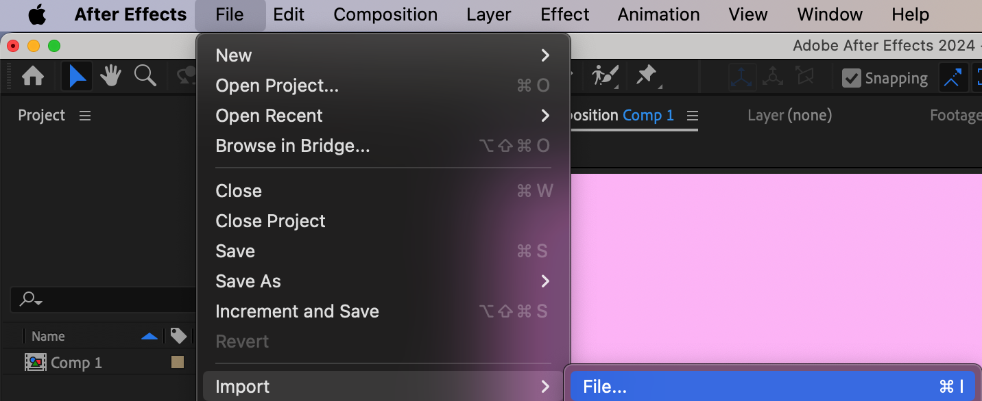 Go to File > Import > File and select your still image. Drag the image into the Timeline Panel to add it to your composition. Adjust its Scale (S) if needed to fit the composition properly.