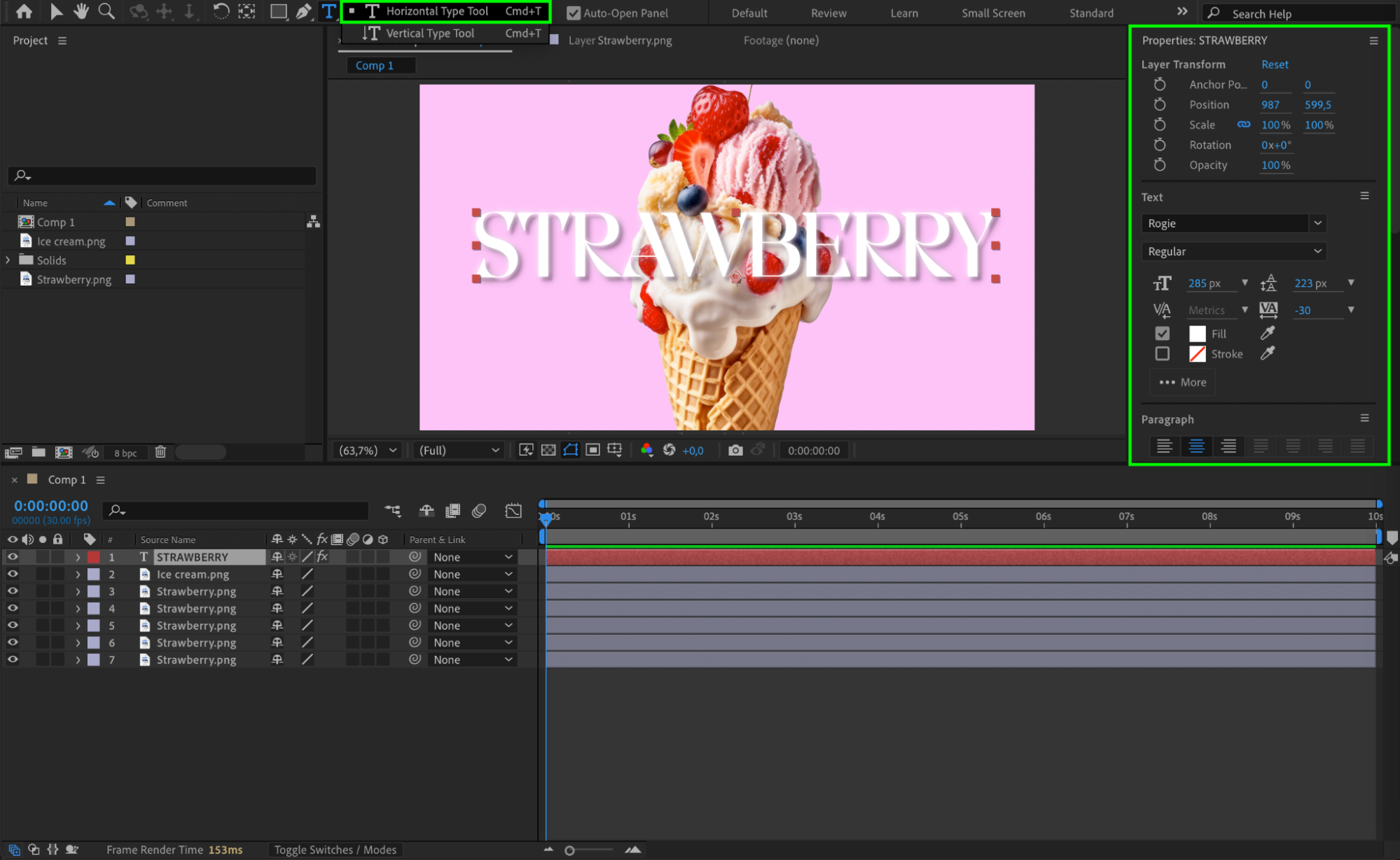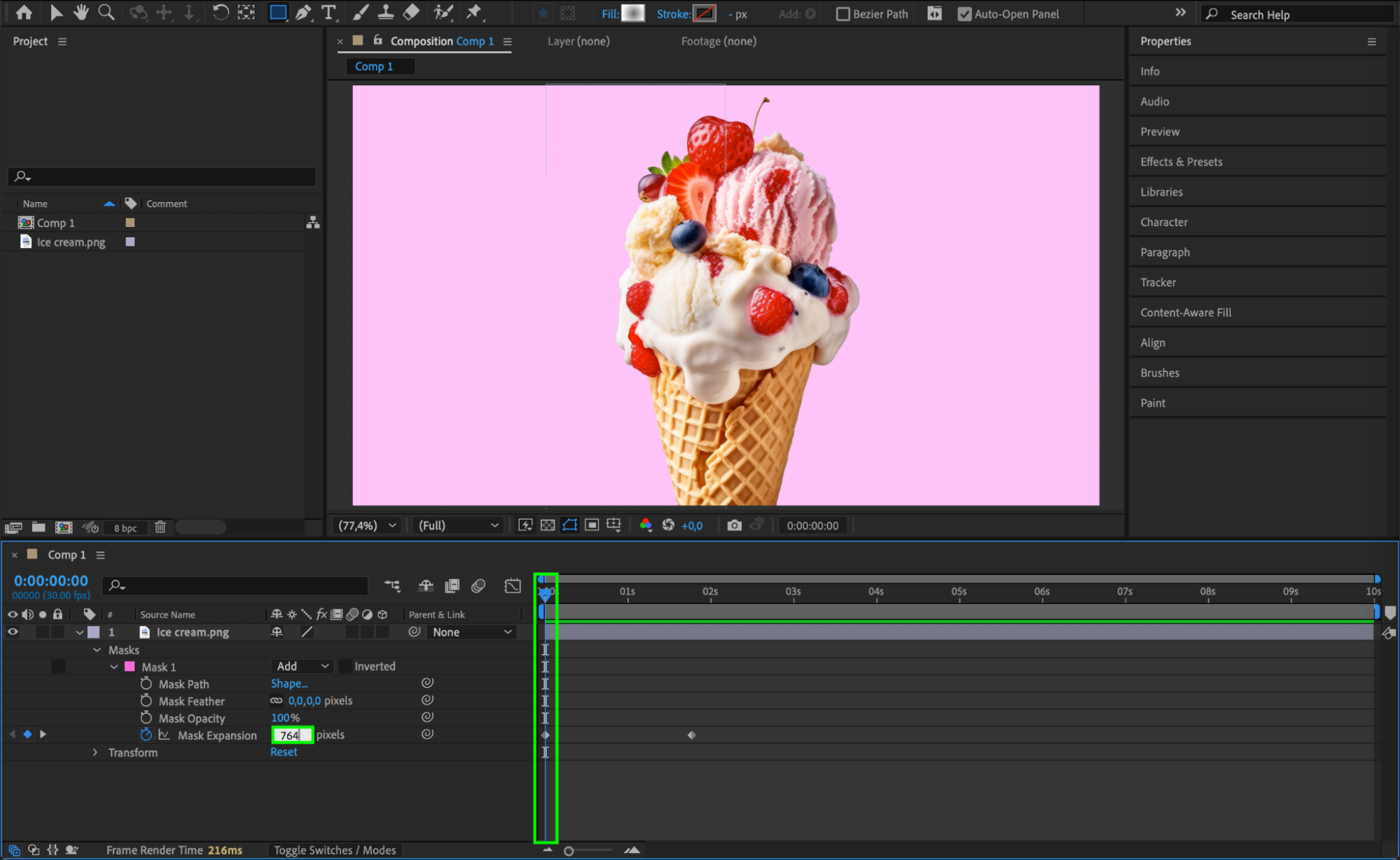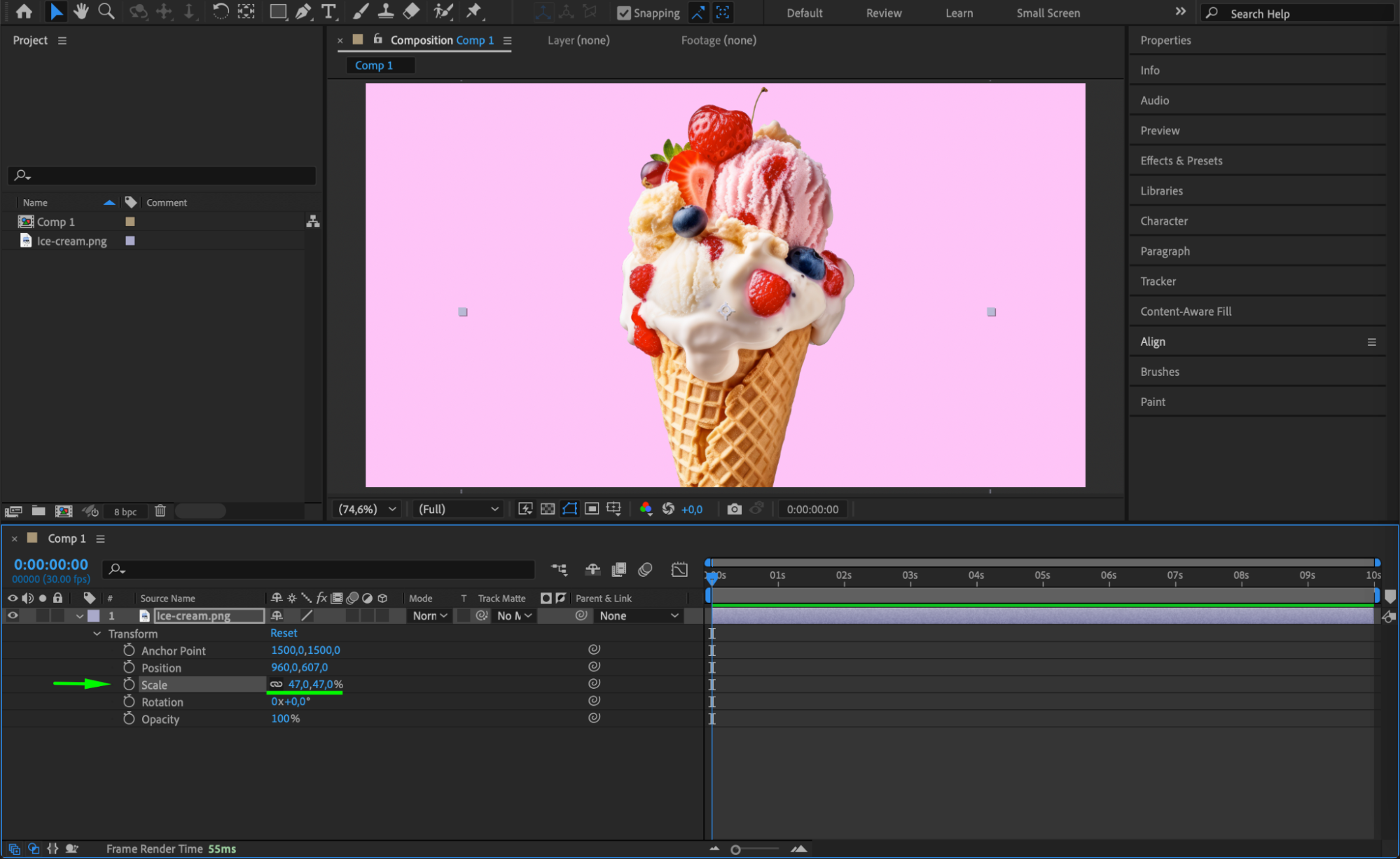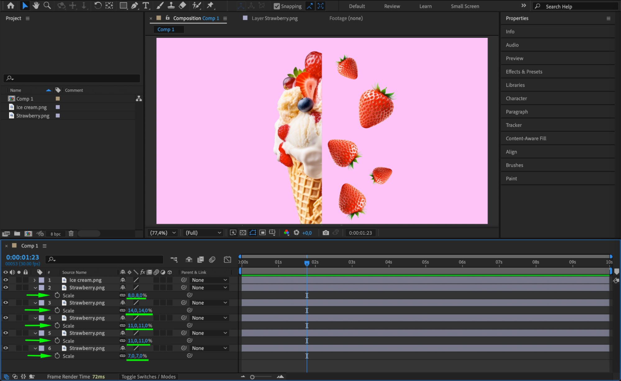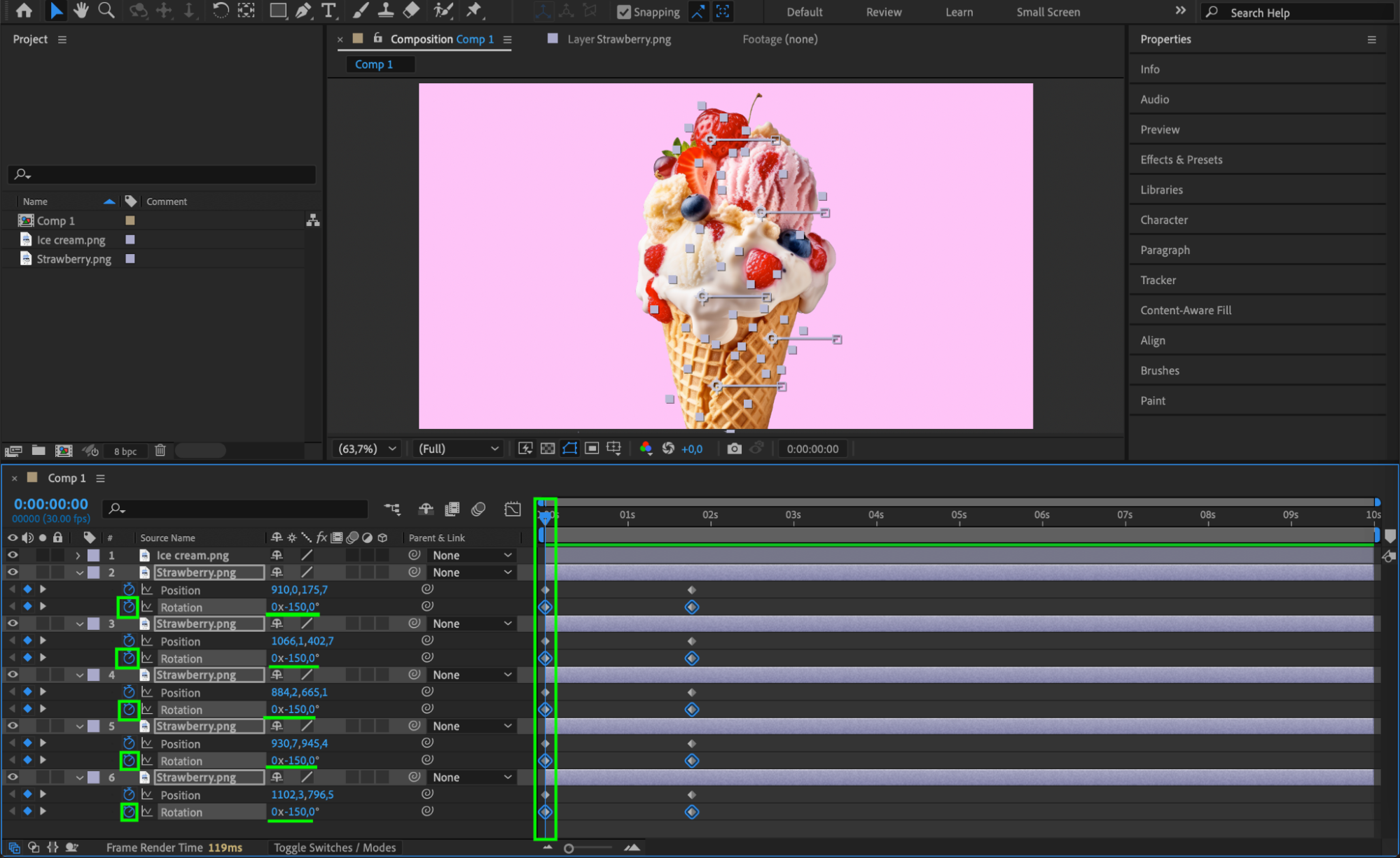 Animate the Position (P) of each image to create movement. For example, if your main image is an ice cream cone, you can animate smaller images, like strawberries, flying out from it. This adds motion and makes the scene more visually appealing.