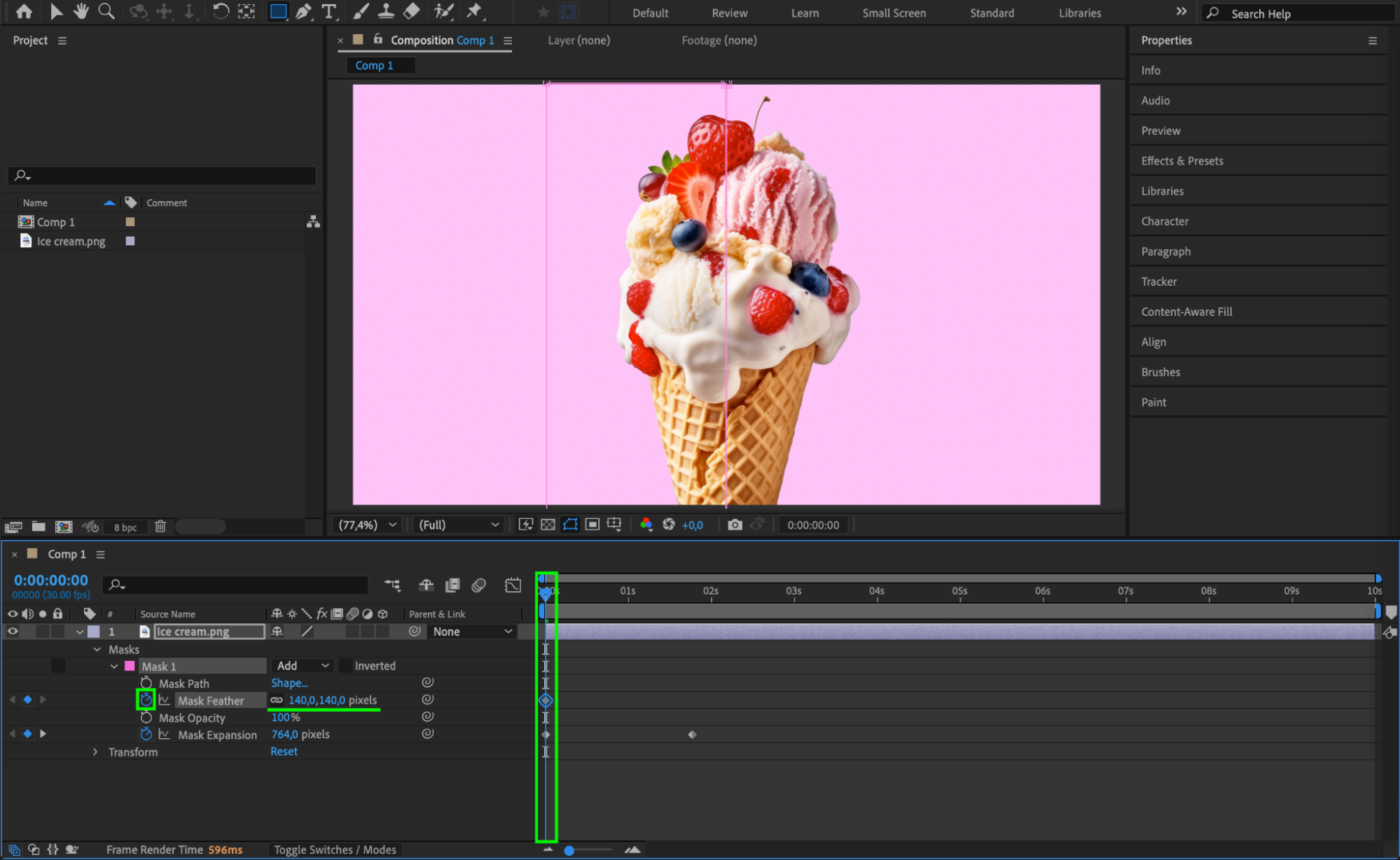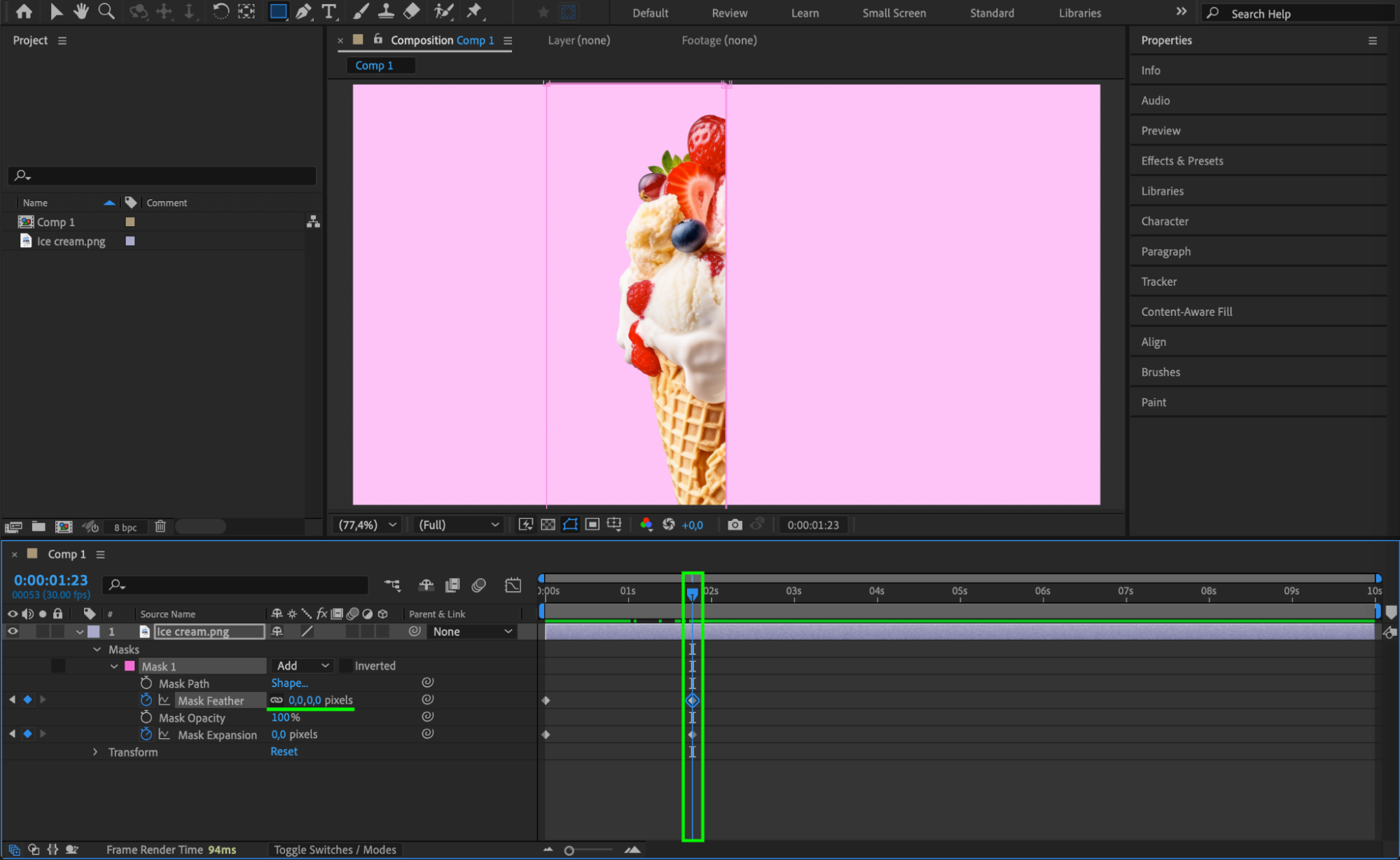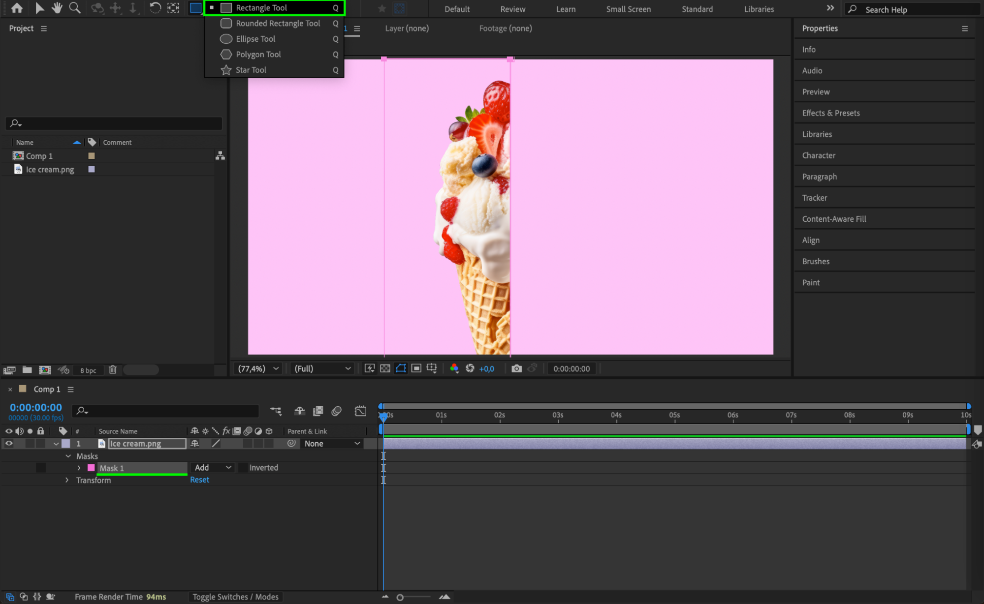 Select the image layer and use the Shape Tool (Q) to create a mask. To animate it, open the Mask properties, and adjust Mask Expansion and Mask Feather over time. This technique can create smooth fade-in or disappearance effects.