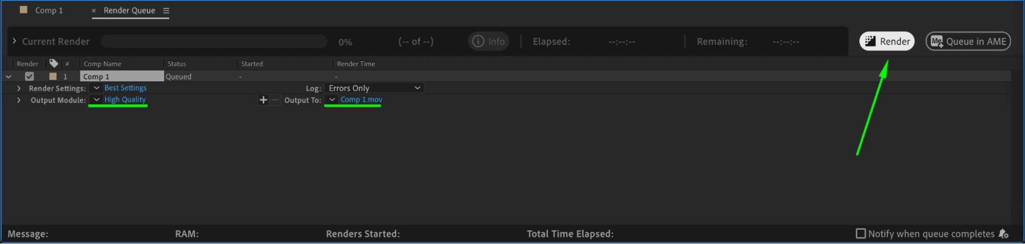 Once satisfied, go to Composition > Add to Render Queue, set your output format, and press Render to export the final animation.