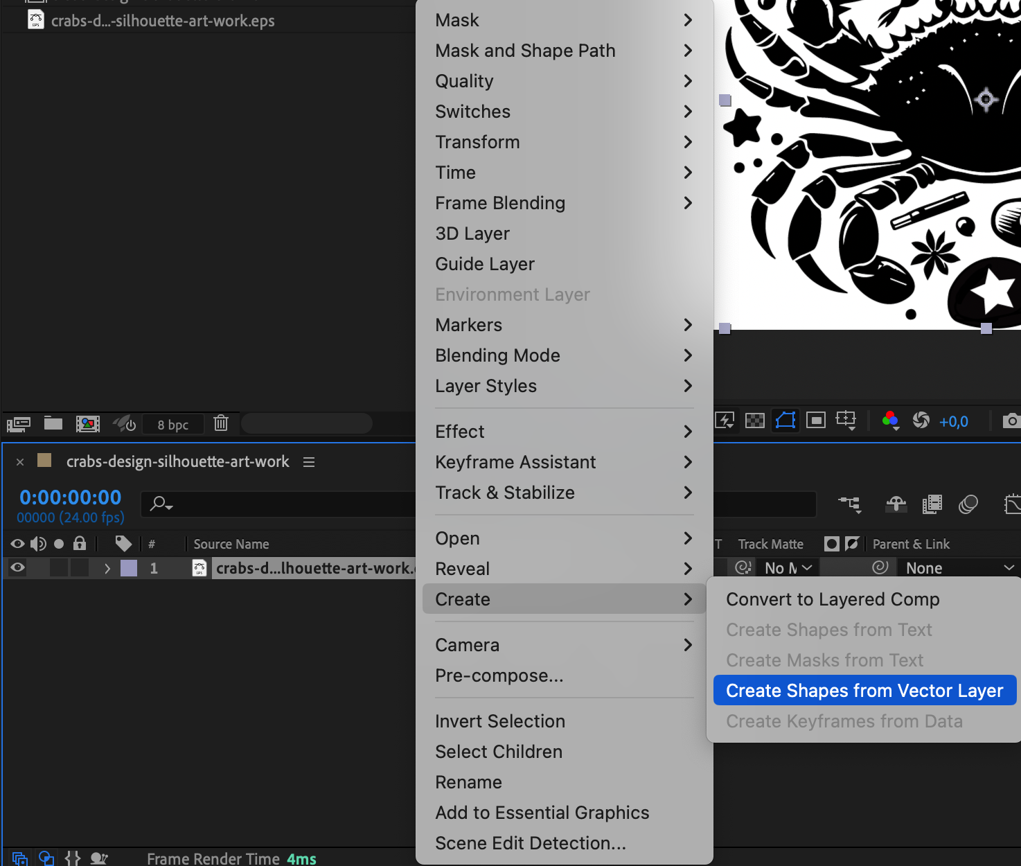Right-click on the AI layer in the Timeline and select Create > Create Shapes from Vector Layer. This step is essential because it converts the Illustrator layer into a shape layer that After Effects can animate more efficiently. You’ll notice that your vector artwork is now in shape form, allowing for advanced editing.