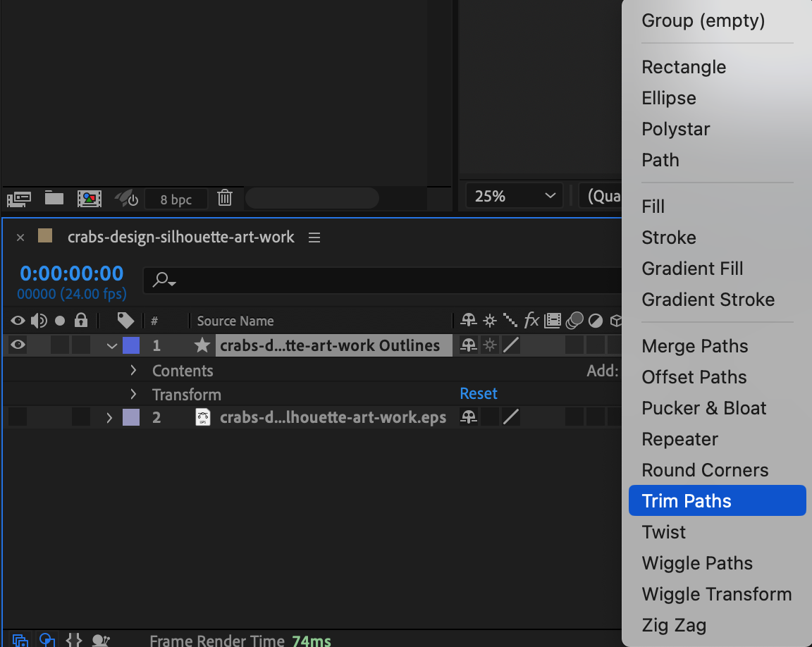 To create a smooth stroke animation, expand the properties of your new shape layer by clicking on the small arrow next to the layer name. Click Add and choose Trim Paths from the submenu.