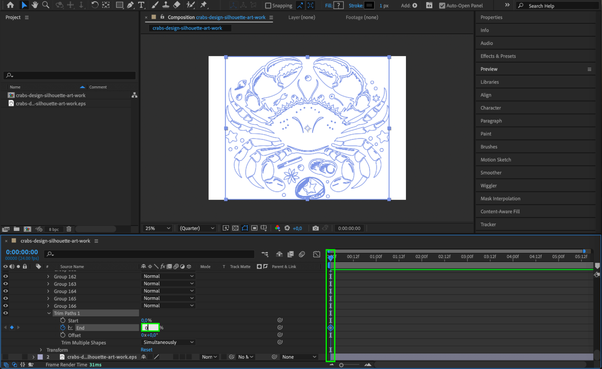 With Trim Paths selected, animate the End parameter. Set the End value to 0% at the beginning of the composition and 100% at the point where you want the animation to complete. This creates a dynamic animation of the lines or shapes being drawn in, making your design come to life.