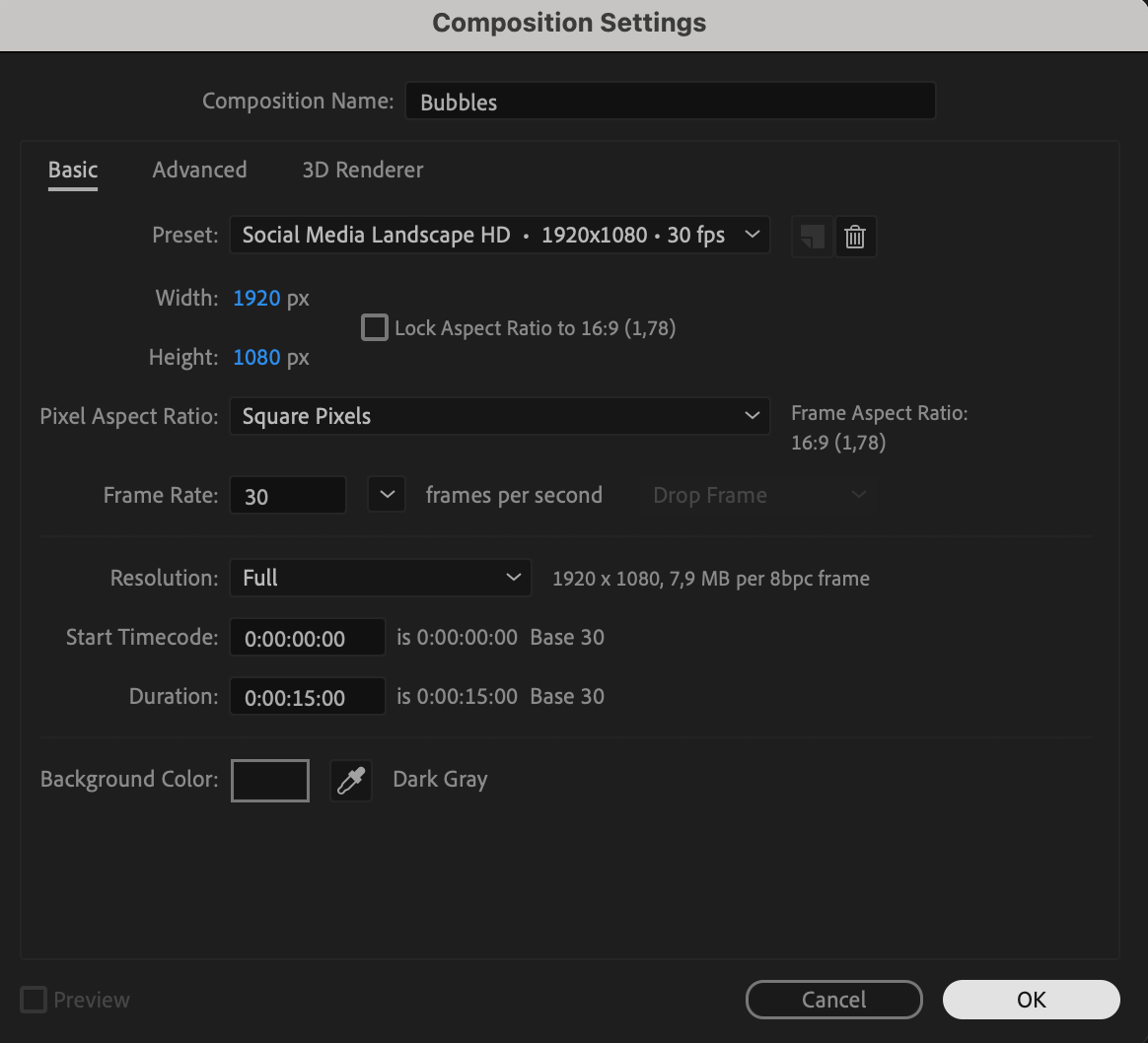 Go to Composition > New Composition, name it “Bubbles”, and set the following parameters: