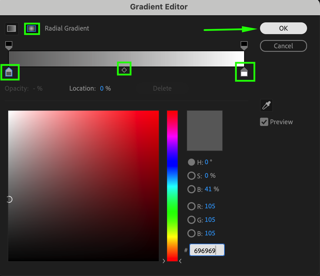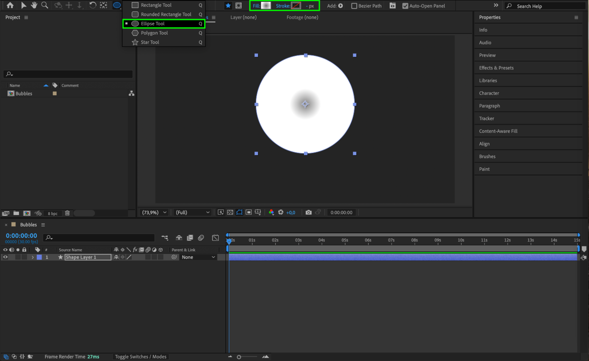 Select the Ellipse Tool (Q) and draw a circle. Set the Fill to Radial Gradient with gray and white colors to create a soft, transparent bubble effect.
